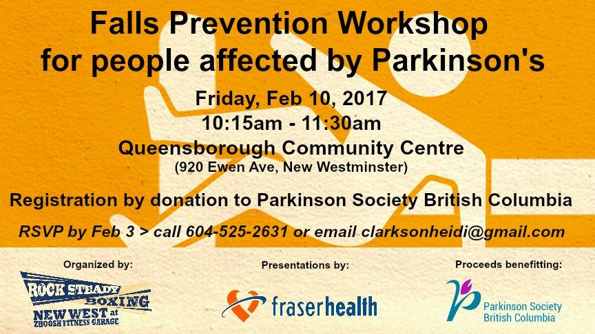 This workshop is intended for people living with Parkinson’s and their carepartners. The presentation will include: 1. The 4 Pillars of Falls Prevention (Home Safety, Exercise, Vision and Medications) 2. Tips and Tricks for Falls Prevention Speakers: Ronda Field, Physiotherapist, Falls & Injury Prevention, Fraser Health Ashley Kwon, Coordinator, Patient Safety and Injury Prevention, Fraser Health Also attending is Caroline Wiggins, Education and Support Services Coordinator, Parkinson Society British Columbia. Register by donation to Parkinson Society British Columbia. Tax receipts will be issued for donations of $20 or more. If a person donates less than $20 but wants a tax receipt, we can issue a tax receipt as long as you complete the donation form that we will have at the event. Please bring your donation to the event. Cash or cheque please. RSVP by Feb 3 by emailing clarksonheidi@gmail.com or calling 604-525-2631 This event is organized by Rock Steady Boxing New West