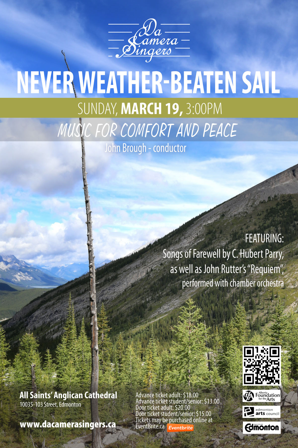 Da Camera Singers’ March 19 concert brings peace and comfort Contemplative works by English composers C. Hubert Parry and John Rutter are featured on the program for Da Camera Singer’s second concert for the 2016-17 season. Also on the program are compositions by Erik Esenvalds and John Tavener. For this concert the choir is accompanied by a chamber orchestra of musicians from the Edmonton Symphony Orchestra: Sunday, March 19, 3:00 p.m. at All Saints’ Anglican Cathedral, 10035 – 103 Street, Edmonton Tickets may be purchased at http://www.dacamerasingers.ca/concert-season/.