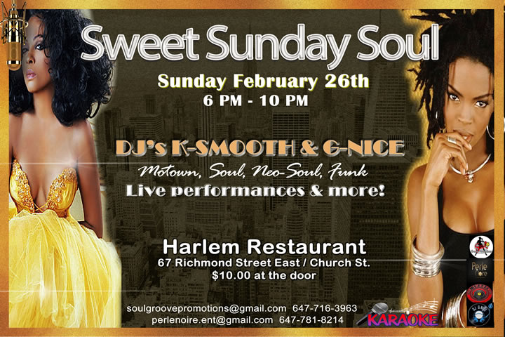 Join us on the last Sunday of Black History Month for Sweet Sunday Soul at Harlem Restaurant! Socialize and listen to some sweet soul music in an inviting atmosphere! Love KARAOKE? We’ll have that to! Provided by BuddyLuv Karaoke Entertainment! We’ll have Live performances and more! DJs K-Smooth & G-Nice will spin your favorite Motown classics, Funk, Soul, and Neo-Soul! So, come on down for a nice Sunday afternoon event! Super L of The Generation Funk Band will be there to entertain! Admission $10.00