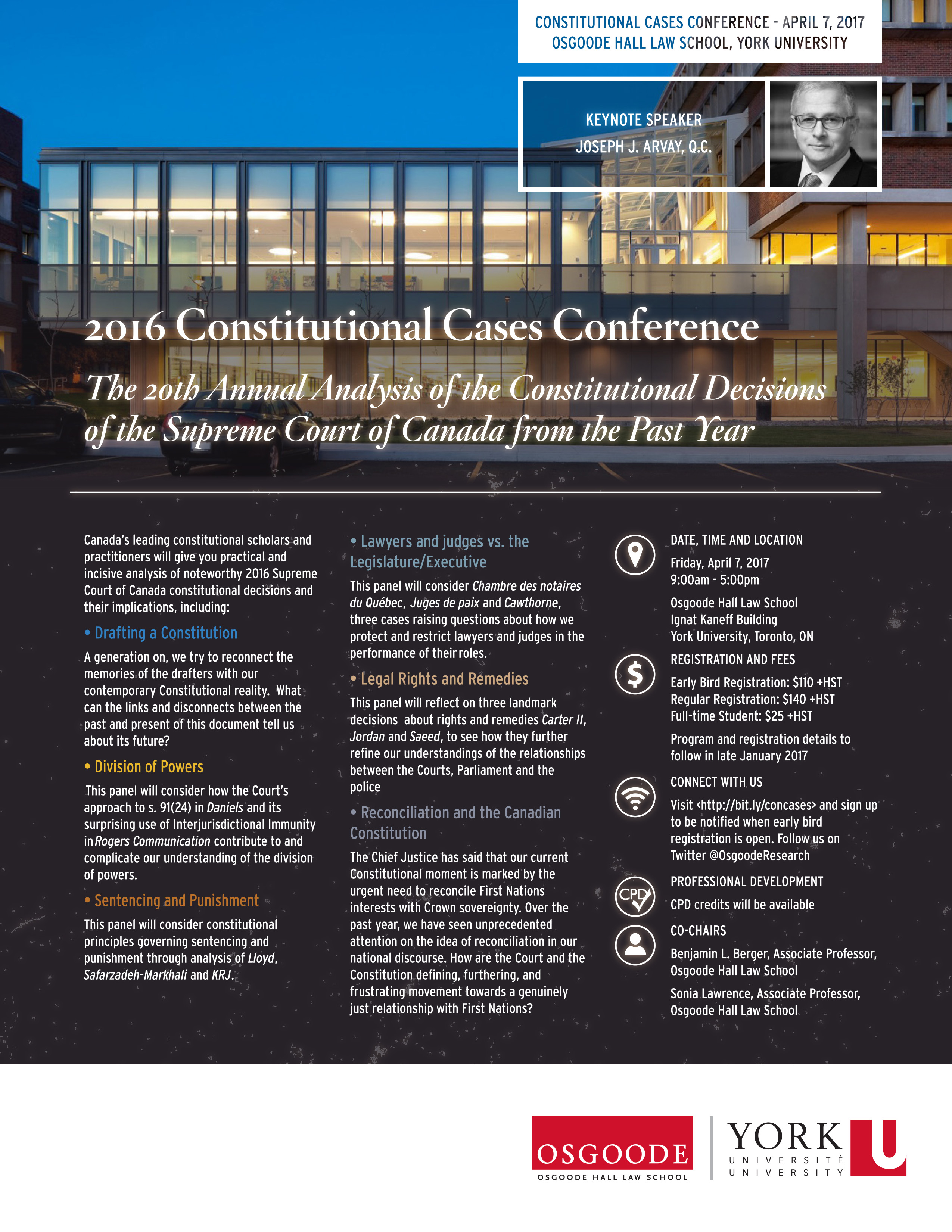 Osgoode’s Constitutional Cases Conference is the leading constitutional law conference in Canada. Now in its 20th successful year, it is the annual gathering of the “who’s who” of constitutional law in Canada. Bringing together the most respected constitutional scholars, practitioners and experts for an insightful and practical analysis of the Supreme Court of Canada’s significant constitutional judgments of the past year, this conference gives you a unique opportunity to get thoroughly up-to-date on the developments that will resonate through all levels of Canadian courts. For full program details and registration, visit http://osgoodeconcases.info.yorku.ca/