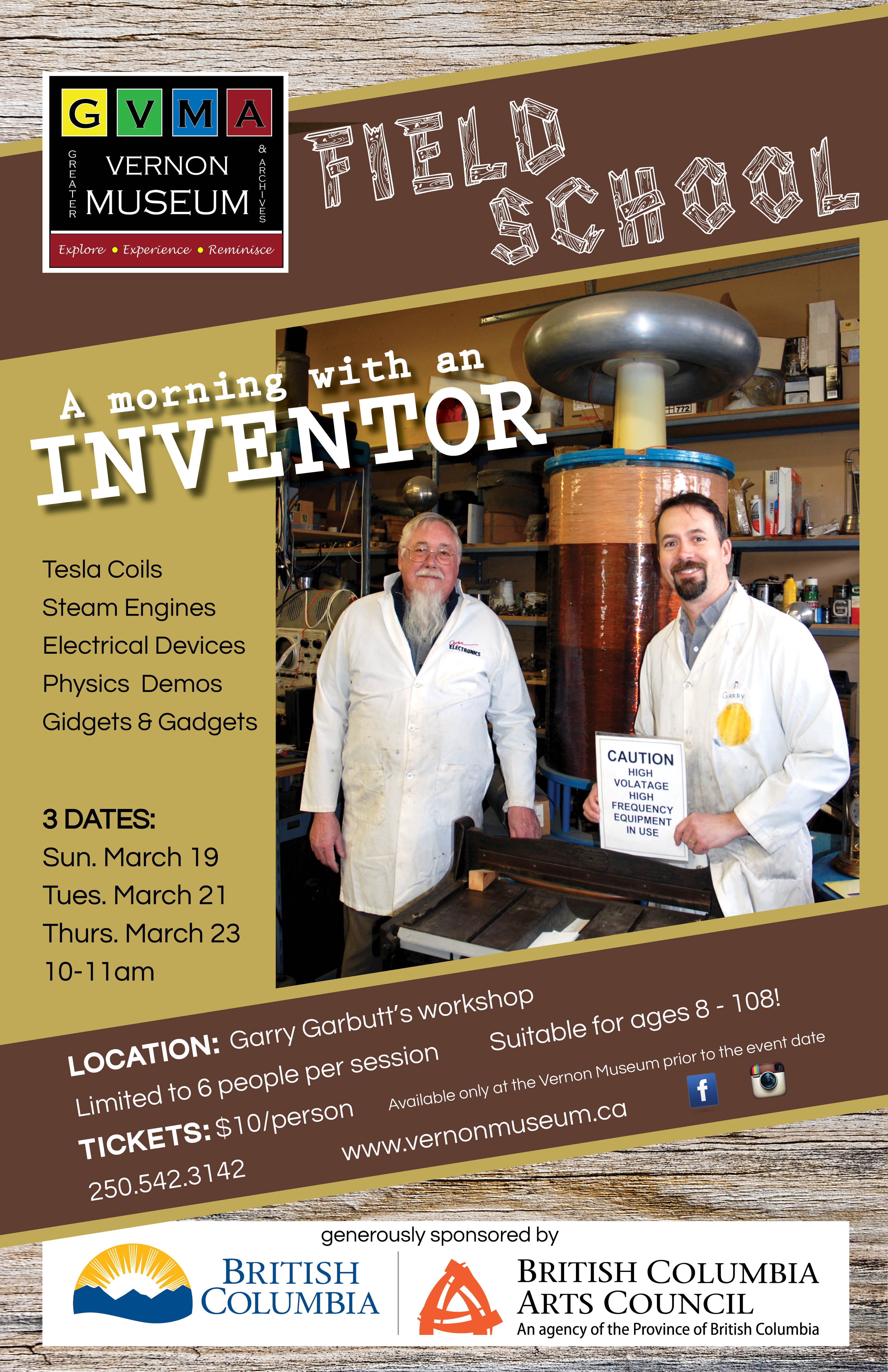 Are you fascinated by electricity? Do you like to create, to tinker, to putz around with machines and tools? Well, how about spending a morning exploring the inventions of Vernon’s own, Mr. Garry Garbutt. Garbutt is opening up his workshop for interested participants between the ages of 8 to 108 to check out his projects, re-creations of early electrical experiments, tesla engines, and fun experiments. This is an opportunity for the curious minded of all ages to learn and be inspired. Topics depend on participant’s interests. Some potential topics are: tesla coils, steam engines, electrical devices, physics demonstrations, and gidgets and gadgets. “A morning with an Inventor” is part of The Field School Series hosted by the Greater Vernon Museum & Archives who are teaming up with local businesses, organizations, and experts who have “historic skills.” Three dates are being offered as he can only accommodate 6 people per session. “A Morning with an Inventor” takes place at Mr. Garbutt’s Workshop on March 19th, 21st, and 23rd from 10:00 to 11:00am. Tickets must be purchased in advance at the Vernon Museum. Cost is $10/person. For more information call (250) 542-3142 visit http://www.vernonmuseum.ca or find us on facebook.