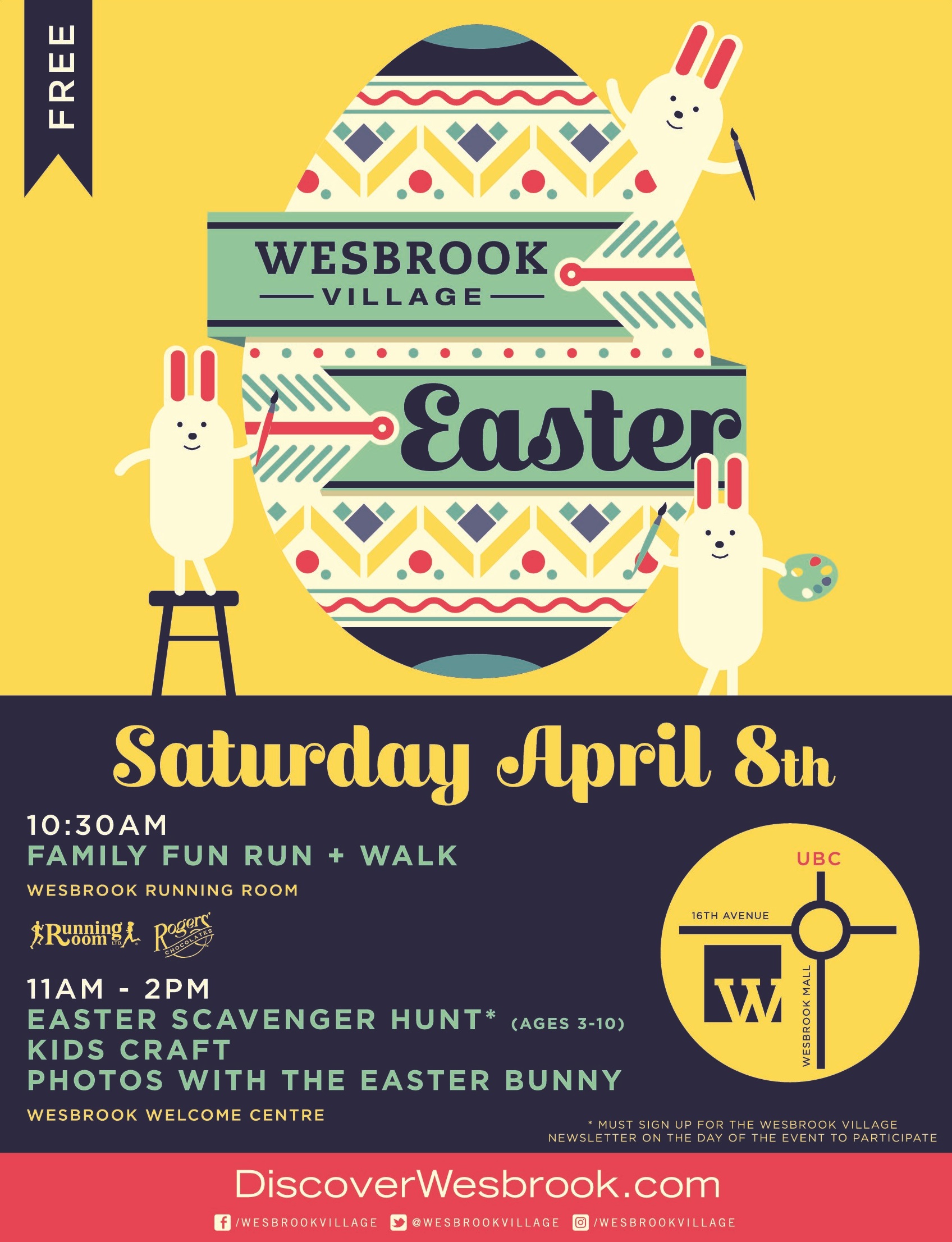 As always, we’ll be celebrating Easter in style at Wesbrook Village, with a true egg-stravaganza. Festivities including an Easter egg scavenger hunt*, little bunnies friendly walk and run, plus a meet and greet with a life-sized Easter bunny (be sure to bring your own camera)! It’s sure to be a hare-raising event, and not something you want to miss. http://discoverwesbrook.com/posts/easter-celebration-at-wesbrook-village-2017#.WMbsS28rKHs *Note: You must be a subscriber to the Wesbrook Newsletter to participate in the scavenger hunt. (Must register on the day of the event.) Date: Saturday, April 8, 2017 Time: 10:30am – 2:00pm Cost: FREE! Location: Wesbrook Village Welcome Centre (3378 Wesbrook Mall, UBC)