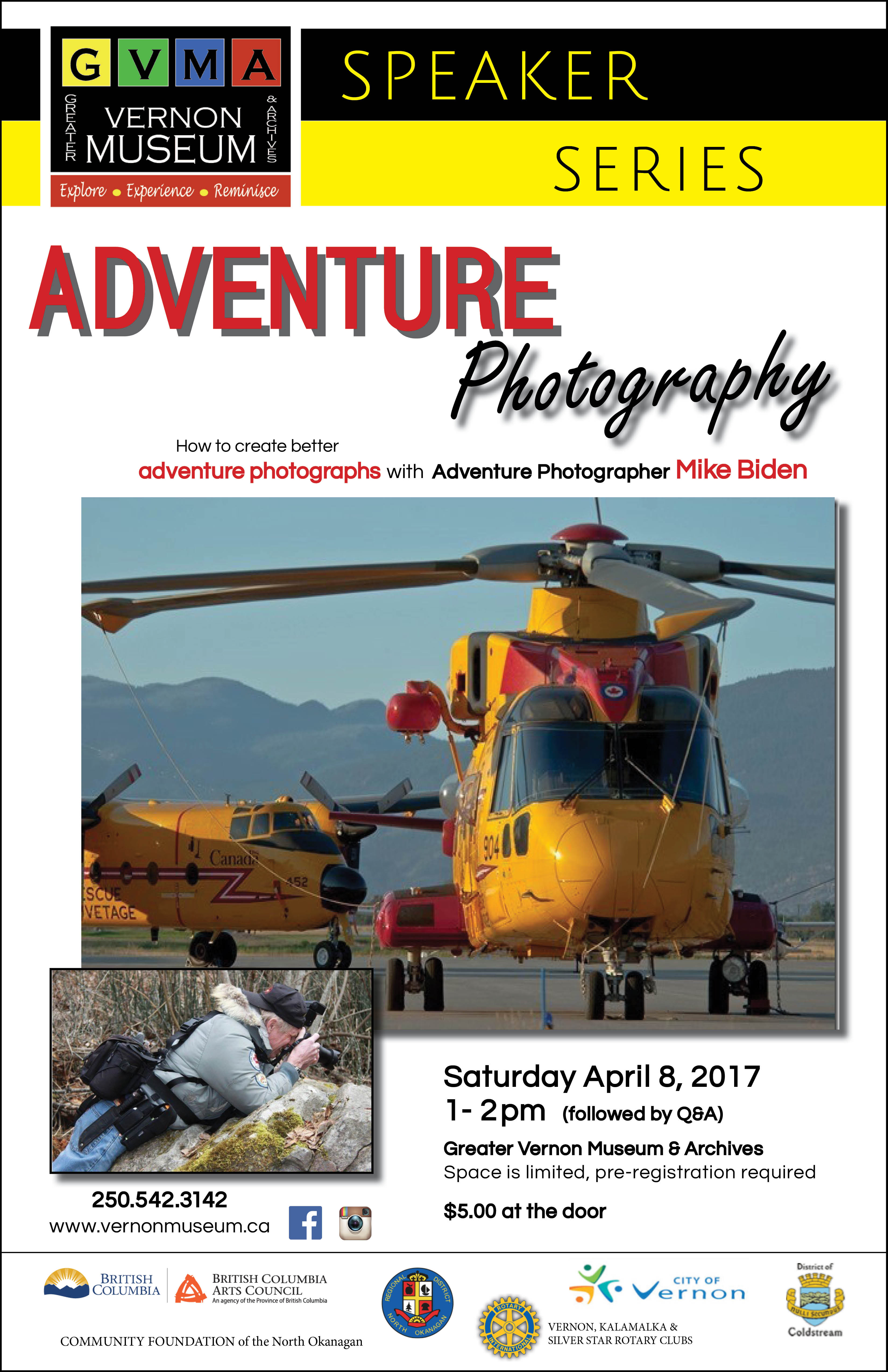 Come meet a man who lives on the edge! Penticton Photographer Mike Biden is the next presenter in the Greater Vernon Museum & Archives Speaker Series. The self-taught photographer and publisher of five books will speak on “Adventure Photography: How to create better adventure photographs.” The well-travelled and publicized photographer has had the privilege of parachuting, riding in hot-air balloons, tanks, jet fighters, World War II vintage airplanes, aircraft carriers and even submarines! His photography tips will be helpful whether you’re in a helicopter, scuba diving or flying jet fighters or WWII air planes with propellers or if you are taking landscapes, portraits, or wild and structure fire photos. Guests will be treated to a slide show of his works and Mike’s most recent book, “Jewels of the Okanagan” will be available for purchase after the talk. The presentation and slide show runs from 1:00-2:00pm, followed by Q & A, Saturday April 8th at the Greater Vernon Museum & Archives. As space is limited, pre-registration is required by calling 250-542-3142. Cost is $5/person at the door. For more information visit http://www.vernonmuseum.ca or find us on facebook.