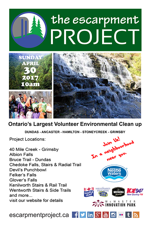Event EndedThe annual Escarpment Project is on Sunday April 30 2017 It is Hamilton’s and Ontario’s largest volunteer environmental clean up. Volunteers gather at various locations across the escarpment from Dundas through Hamilton and Stoney Creek to Grimsby and remove the litter and debris that has been left there. Afterwards there is a BBQ festival for all the volunteers at Punchbowl Market – 123 Ridge Road in Stoney Creek. For more info visit http://www.escarpmentproject.ca