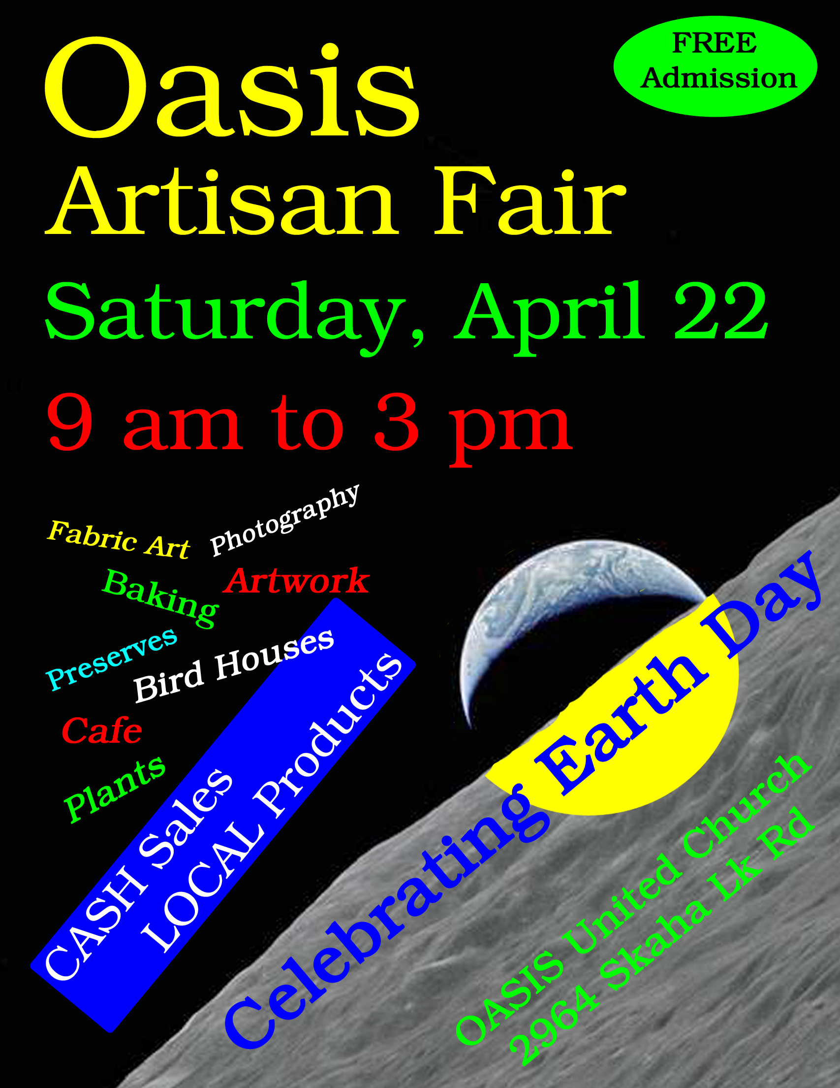 Celebrate Earth Day at the Oasis Artisan Fair. All locally made products and crafts with a café featuring fabric arts, food products, artwork and photography, skincare, birdhouses and much more!