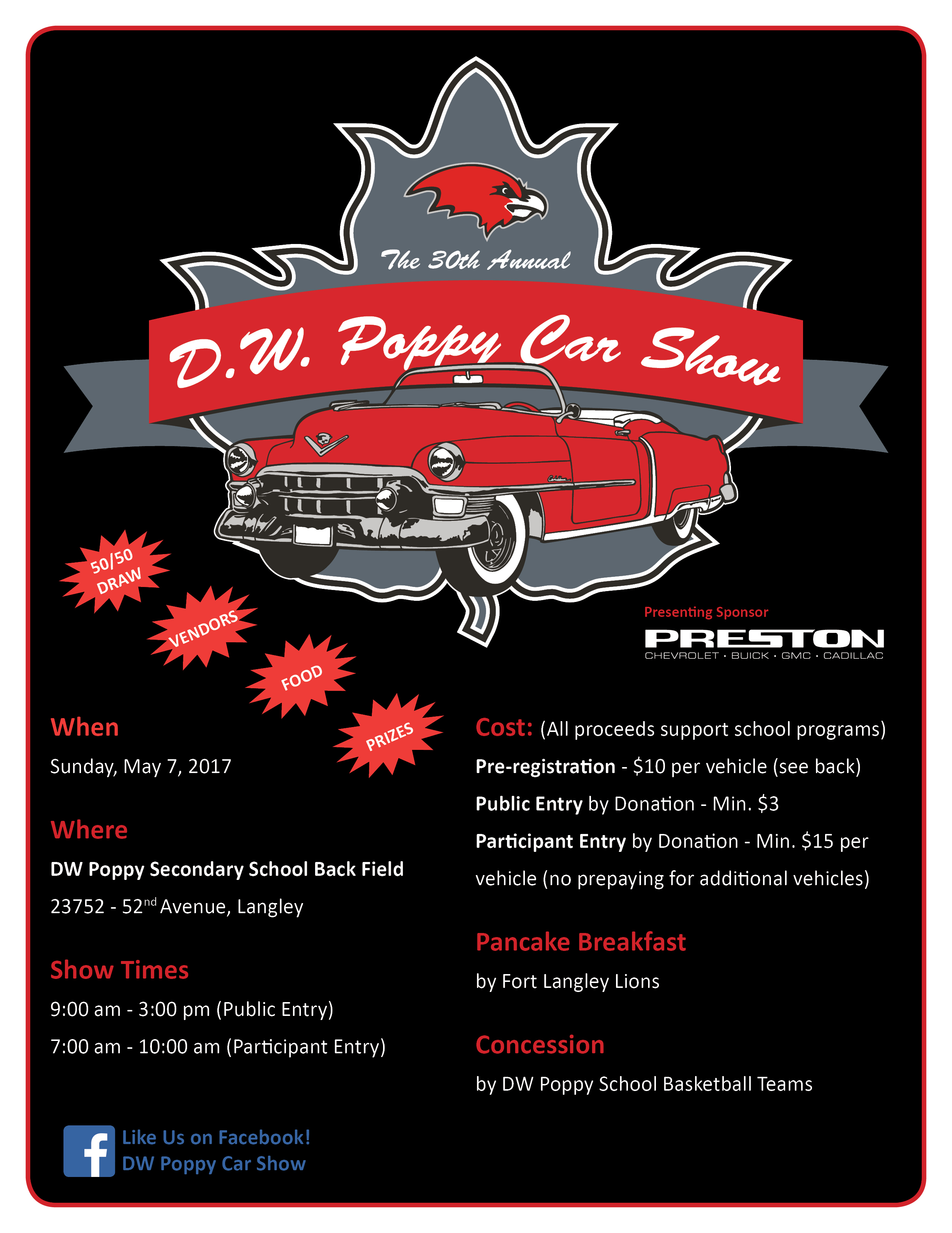 D.W. Poppy Secondary is getting ready to host its 30th annual Car Show on Sunday May 7th! Our tradition of putting on one of the first car shows of the season brings many benefits for the school. We hope to see over 700 cars on display in our school back field, and welcome thousands of spectators. This is a family friendly all ages event. We are hoping to increase our spectator traffic this year to enjoy our show that includes up to 700 collector cars, vendors, concession, 50/50 draws, car show t-shirt sales and more. The event is our school’s biggest fundraiser and benefits our entire school including the shops and school technology, athletic teams, dry grad and many others. The shop and tech ed departments are able to purchase tools and technology that are used for the student’s projects and around the school – this year the wish list includes a Spray Wash Solvent Tank, a Sand Blaster, a Hydraulic Pipe bender and computer technology including a Document Reader. By volunteering to help with the show, it teaches our students the value of contributing to, and being part of a community and the importance of giving back. Their volunteer time at the car show offers them increased opportunities thru the school that enrich their academic experience such as athletic trips, the school race car, Dry Grad celebration and more. You will find students helping out on the day of the show at the concession, the gates, on the grounds and during setup/clean up. It is also an opportunity for the school to connect and network with the local community – this year we are again looking forward to welcoming the Fort Langley Lions Club who will be offering a pancake breakfast in the morning to our exhibitors and spectators. Early Bird Registration for cars is $10 and will open on March 10th until May 5th or sold out, and is available online thru https://www.brownpapertickets.com/user/manageevent/2893791 or in person at the school office from 7:45-3:15 Monday- Friday March 27th following Spring Break. Registration at the show if minimum donation of $15 and public entry starting at 9 am – 3 pm is minimum donation $3.00. We hope that you are able to come out and join us Sunday May 7th and help us celebrate our 30th anniversary! For sponsorship or vending opportunities please contact Marlene Yakabuski at 604-612-7645 or Jackie Cook at 778-994-7753.