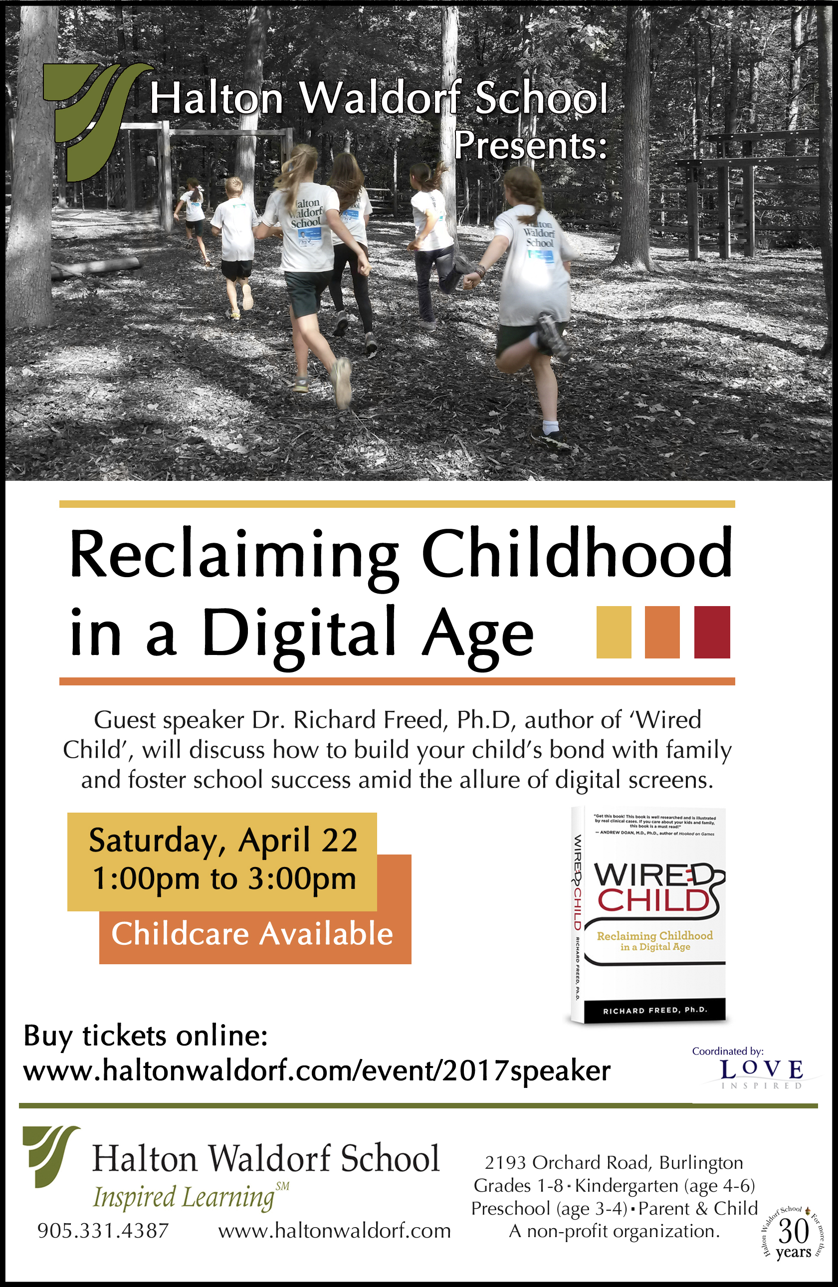 Halton Waldorf School presents, “Reclaiming Childhood in a Digital Age”. Dr. Richard Freed, Ph.D., author of “Wired Child” will discuss how to build your child’s bond with family and foster school success amid the allure of digital screens. Richard is a child and adolescent psychologist and a leading authority on raising children in the digital age. This talk will give you the confidence and skills you need to safely navigate your child through a rapidly shifting media landscape. Dr. Freed offers concrete parenting strategies that will help you create the strong family kids need and encourage their school success. Childcare is available.
