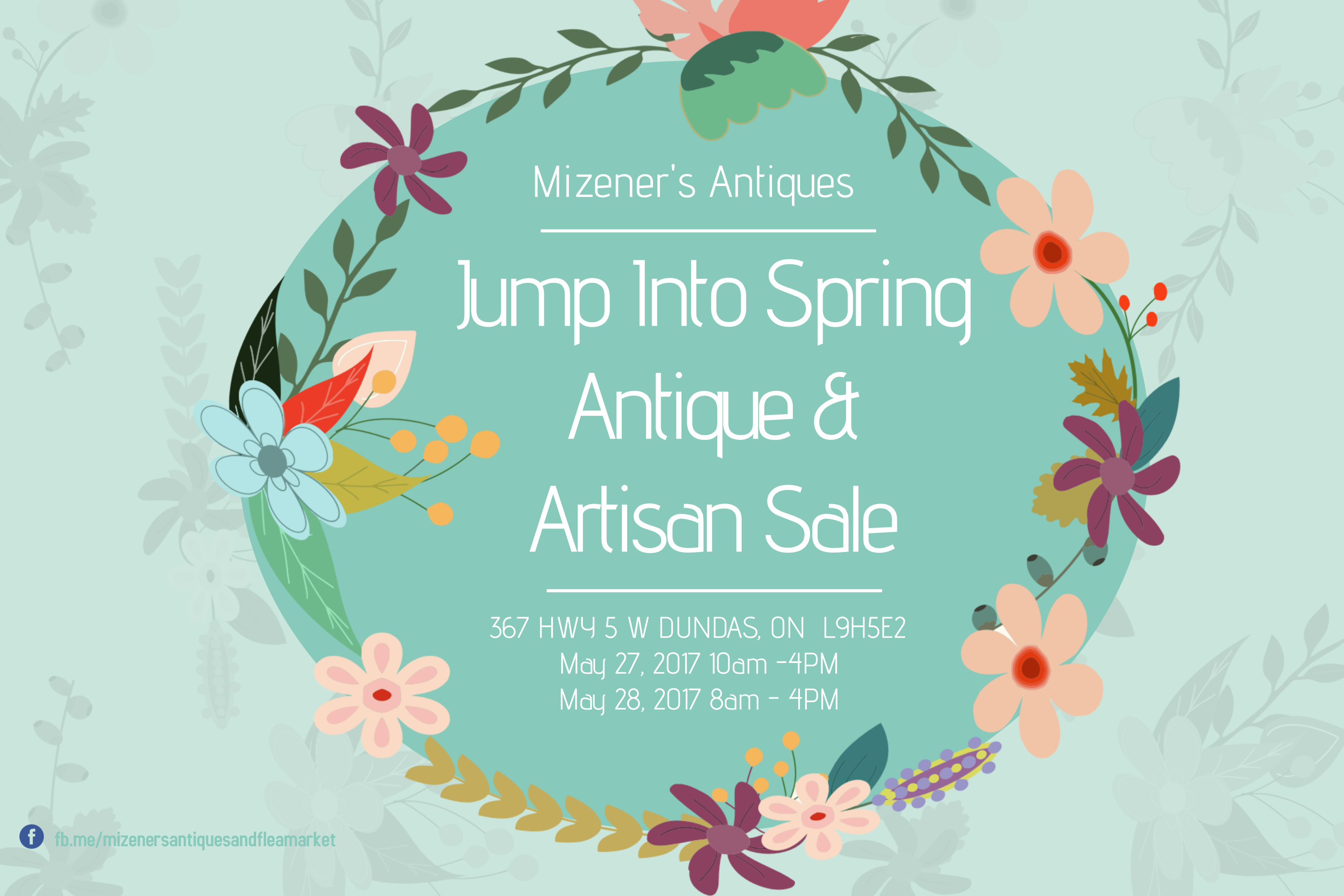 Hosted at Mizener’s Antiques & Flea Market Come Jump Into Spring with us ! Saturday and Sunday will be filled with all of our Antique Vendors plus Crafters, Artisans and more! Come out and have a truly one of a kind shopping experience filled with fun for the Entire Family! Saturday May 27 @ 10:00am – 4:00pm Sunday May 28 @8:00am – 4:00pm 367 Highway 5 West, Dundas, ON