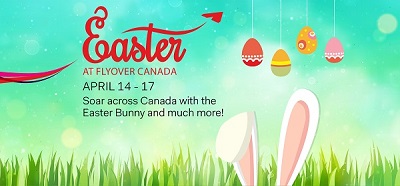 The Easter Bunny is making a special appearance at FlyOver Canada over Easter weekend. Guests will soar coast-to-coast across Canada with the Easter Bunny from 11:00 AM until 2:00 PM daily. The Easter Bunny will be leading our young aviators as they search for chocolate eggs at our annual outdoor Easter egg hunts on Sunday April 16 & Monday April 17, 2017, at 11:00 AM and 2:00 PM. Space is limited and registration is required. Visit http://www.flyovercanada.com/easter to learn more and reserve your spot now. ** To enter FlyOver Canada, children must be at least 102cm (40″) tall. Children (12 and under) must be accompanied by an adult or guardian (14 years or older).
