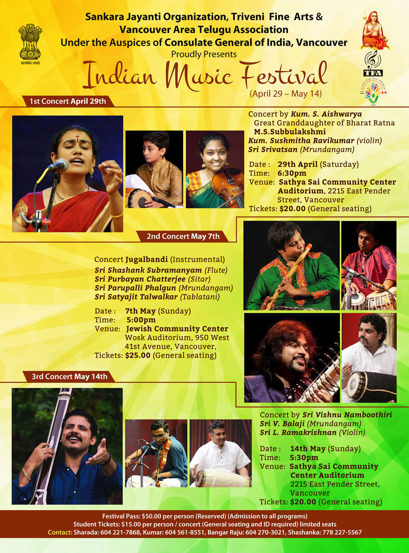 Indian Music Festival Presented by SJO, Triveni,and VATA Under the auspices of the Consulate General of India, Vancouver April 29th, May 7th, May 14th April 29 – May 14, 2017 at: Sathya Sai Community Center & Jewish Community Centre cost: details below April 29th: Kum S. Aishwarya (great granddaughter of Bharata Ratna M.S. Subbulakshmi, and winner of numerous awards) and party 6:30 pm, Sathya Sai Community Center Auditorium, 2215 East Pender Street, Vancouver. Tickets: $20. (General Seating) Student $15.00 May 7th: Instrumental Jagalbandi by Sri Shashank Subramanyam (a Grammy nominated flautist who has won numerous accolades), Sri Purbayan Chatterjee (sitar player, composer, and winner of many awards), and party, Sunday, May 7, 2017, 5:00 pm, Jewish Community Center, WOSK Auditorium, 950 West 41st Avenue, Vancouver. Tickets: $25. (General Seating) $15.00 Student May 14th: Sri Vishnu Namboothiri (Carnatic Music Idol, 2012) and party, 5:30 pm, Sathya Sai Community Center Auditorium, 2215 East Pender Street, Vancouver. Tickets: $20. (General Seating) $15.00 Student Tickets: (1) Individual Concerts: Prices as indicated above. (General Admission.) (2) Festival Pass: $50 for all 3 concerts. (Reserved Seats.) Tickets will available at Banyen at 604-737-8858 and online soon at http://www.vtixonline.com Video for May 7th Concert (Instrumental) Shashank Subramanium (Carnatic Flute) and Purbayan Chatterjee (Sitar) at Darbar Festival https://youtu.be/42W5Q5kJmZk?list=RD42W5Q5kJmZk Indian Music Festival Presented by SJO, Triveni,and VATA Under the auspices of the Consulate General of India, Vancouver April 29th, May 7th, May 14th April 29 – May 14, 2017 at: Sathya Sai Community Center & Jewish Community Centre cost: details below April 29th: Kum S. Aishwarya (great granddaughter of Bharata Ratna M.S. Subbulakshmi, and winner of numerous awards) and party 6:30 pm, Sathya Sai Community Center Auditorium, 2215 East Pender Street, Vancouver. Tickets: $20. (General Seating) Student $15.00 May 7th: Instrumental Jagalbandi by Sri Shashank Subramanyam (a Grammy nominated flautist who has won numerous accolades), Sri Purbayan Chatterjee (sitar player, composer, and winner of many awards), and party, Sunday, May 7, 2017, 5:00 pm, Jewish Community Center, WOSK Auditorium, 950 West 41st Avenue, Vancouver. Tickets: $25. (General Seating) $15.00 Student May 14th: Sri Vishnu Namboothiri (Carnatic Music Idol, 2012) and party, 5:30 pm, Sathya Sai Community Center Auditorium, 2215 East Pender Street, Vancouver. Tickets: $20. (General Seating) $15.00 Student Tickets: (1) Individual Concerts: Prices as indicated above. (General Admission.) (2) Festival Pass: $50 for all 3 concerts. (Reserved Seats.) Tickets will available at Banyen at 604-737-8858 and online soon at http://www.vtixonline.com Video for May 7th Concert (Instrumental) Shashank Subramanium (Carnatic Flute) and Purbayan Chatterjee (Sitar) at Durbar Festival https://youtu.be/42W5Q5kJmZk?list=RD42W5Q5kJmZk