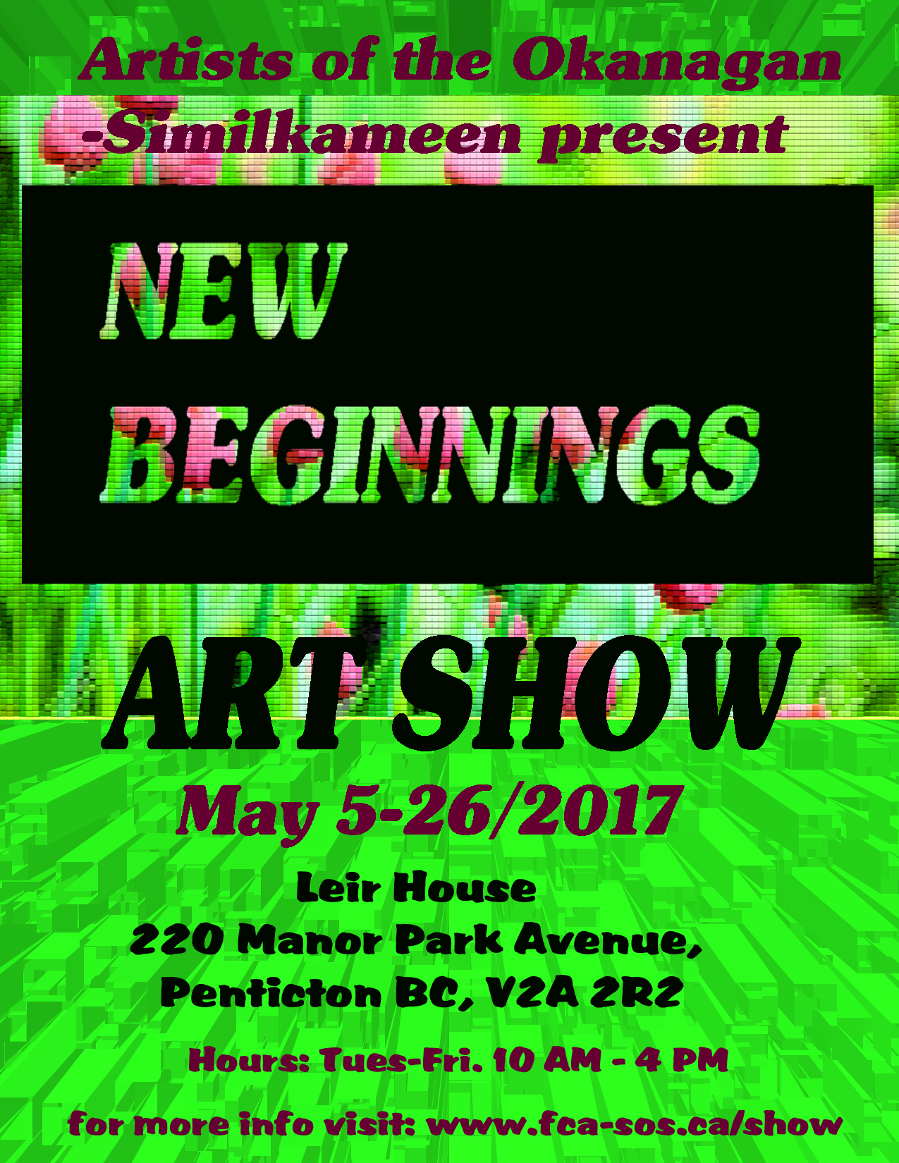 During this long awaited spring season why not pair your wine touring with some Art touring ! The Artists of the South Okanagan-Similkameen are pleased to be showing a collection of member works in their upcoming spring exhibit “New Beginnings” at Leir House Cultural Centre, 220 Manor Park Avenue, Penticton B.C. Duration of exhibit: May 5-May 26th /2017 Tuesday-Friday 10:00AM -4:00PM. For more information please visit our website at http://fca-sos.ca/show