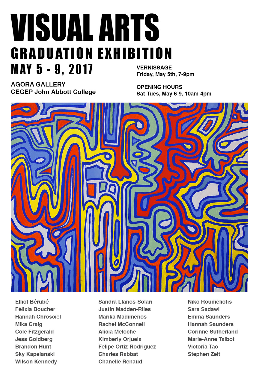 Every year the graduating students of the Visual Arts Program at John Abbott College put together an exhibition of their best work. In their final semester of study, students work closely with faculty and technicians to develop their own creative studio projects. Building on the knowledge gained in various disciplines including painting, drawing, print making, sculpture, and electronic media, students are guided through the planning, research and creation of advanced independent artwork. Upon completion of their projects, students choose their best works to be included in the exhibition. All students participate in the preparation and installation of the graduation exhibition. This process introduces them to all the steps involved in organizing a professional public exhibition of their work. With the help of faculty and technicians, students prepare the walls, set up lighting and solve spatial problems related to the placement and hanging of works in the gallery. The vernissage is a time for celebrating our graduating students’ accomplishments. This special evening is often the first time students show their work in pubic. Parents, family and friends are invited to come appreciate and discuss the artwork in this celebratory setting. We are proud to exhibit the ambitious works of our graduating students. It is an important event for the Visual Arts Program and for these young artists. We hope you enjoy the show.