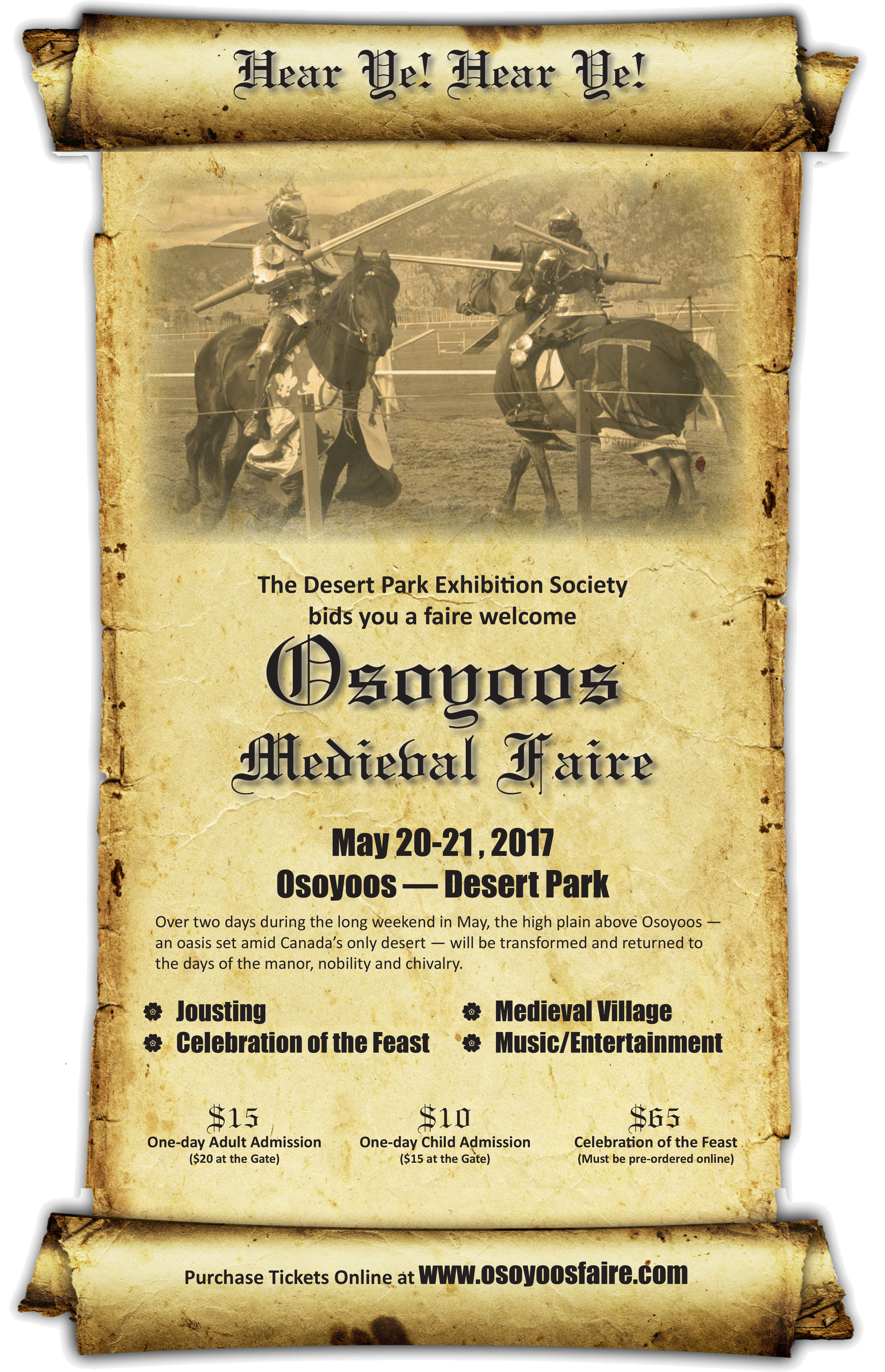 Where the past is present! Experience the Middle Ages with live jousting, food fit for a king & queen, games and a vast array of entertainment. Live Celtic music by Vazzy, a medieval village with vendors and a pub. Medieval feast Saturday at 6 p.m. for $65. Jousts at noon and 4 p.m. May 20 & 21. General admission tickets available at the Osoyoos Times office or online at osoyoosfaire.com.