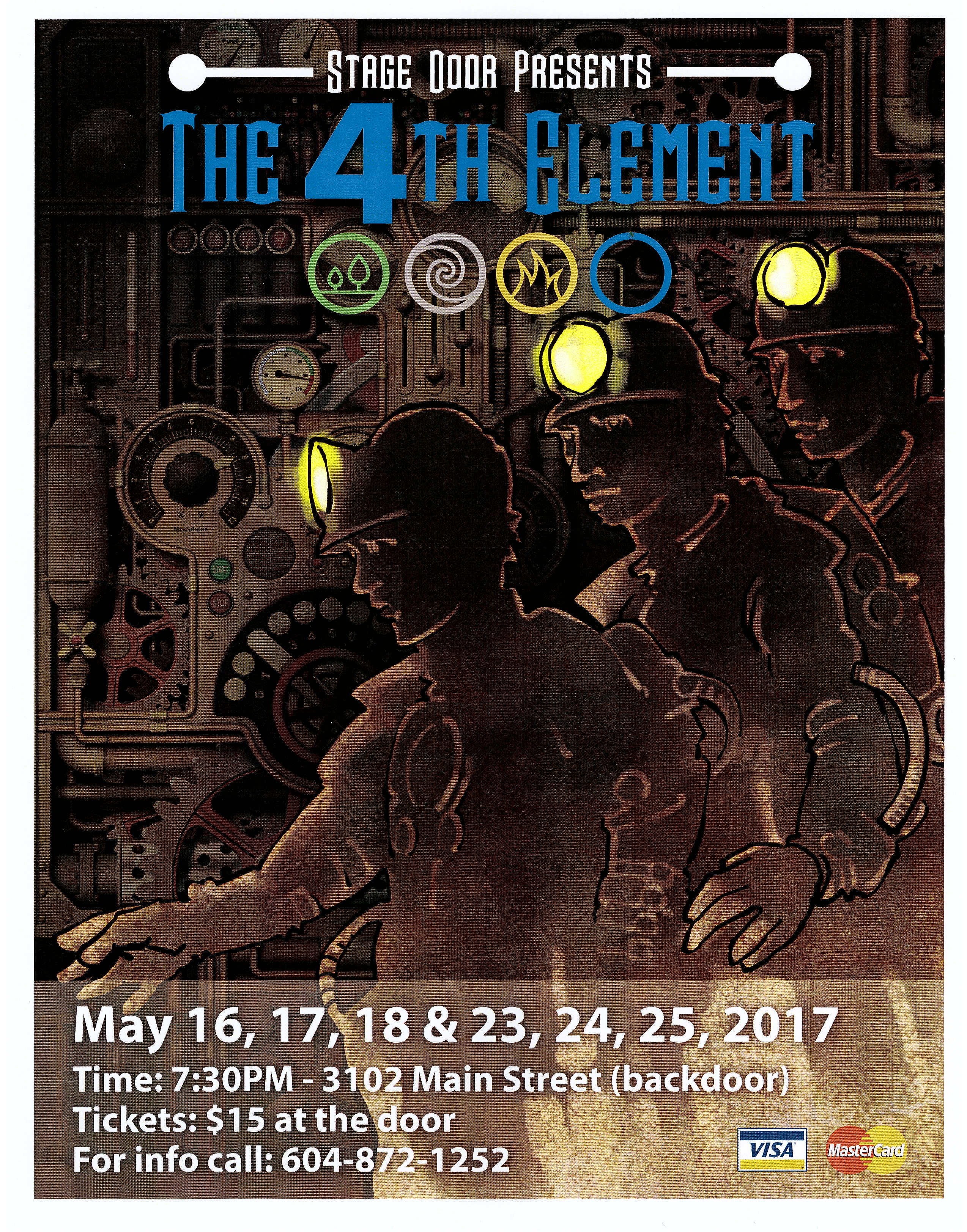 In a world desperate for water, a band of ‘Water Miners’ search a post-apocalyptic underworld in search of pipes that may contain the prized element. In a desperate struggle to stay alive the band of brothers stumble upon the tragic reason for the earth’s drought problem. Upon receiving Sage advice from an Old Mage, the group go in search of the 4th Element in order to restore balance in the world and save their dwindling society. But can the Water Miners adopt the sage advice? Can they find balance within themselves and work together in order to save their dying planet? Stage Door Theatre Troupe presents “The 4th Element”. A play about the human spirit, overcoming individual selfishness, and the awareness of how we together can harm or heal world in which we live.