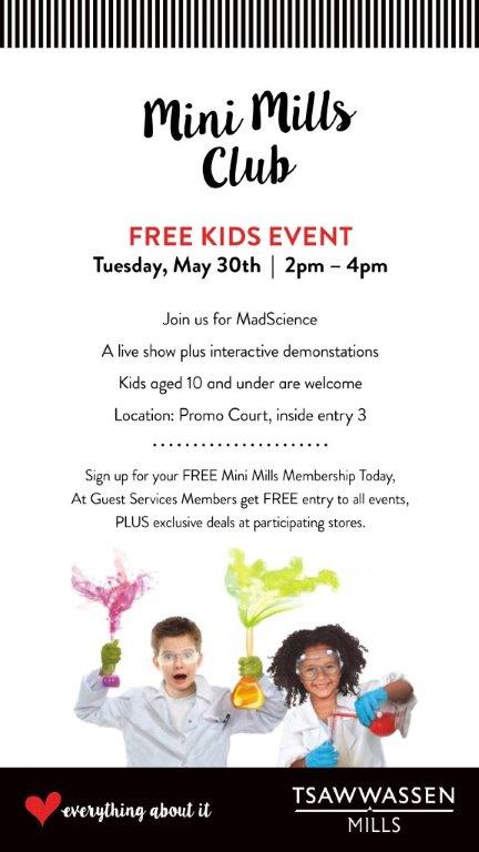 Mini Mills kids club at Tsawwassen Mills will host their May, Mad Science live show and interactive demonstrations on Tuesday, May 30th. Mini Mills is a Free and exciting loyalty program for children aged 10 and under, offering discounts at participating retailers throughout the mall. Membership is free and shoppers can sign up at Guest Services. The Mad Science Spectacular Shows are fast paced, high energy, exciting performances that combine a little bit of magic with a lot of science to generate a whole bunch of fun. Join us for some FREE family fun and great shopping all under one roof. Event Details: When:Tuesday, May 30th from 2pm – 4pm Where: Tsawwassen Mills – Entry 3 What: Mad Science live show and fun stations https://www.tsawwassenmills.com/promotions-events/events/2017/05/30/mad-science/
