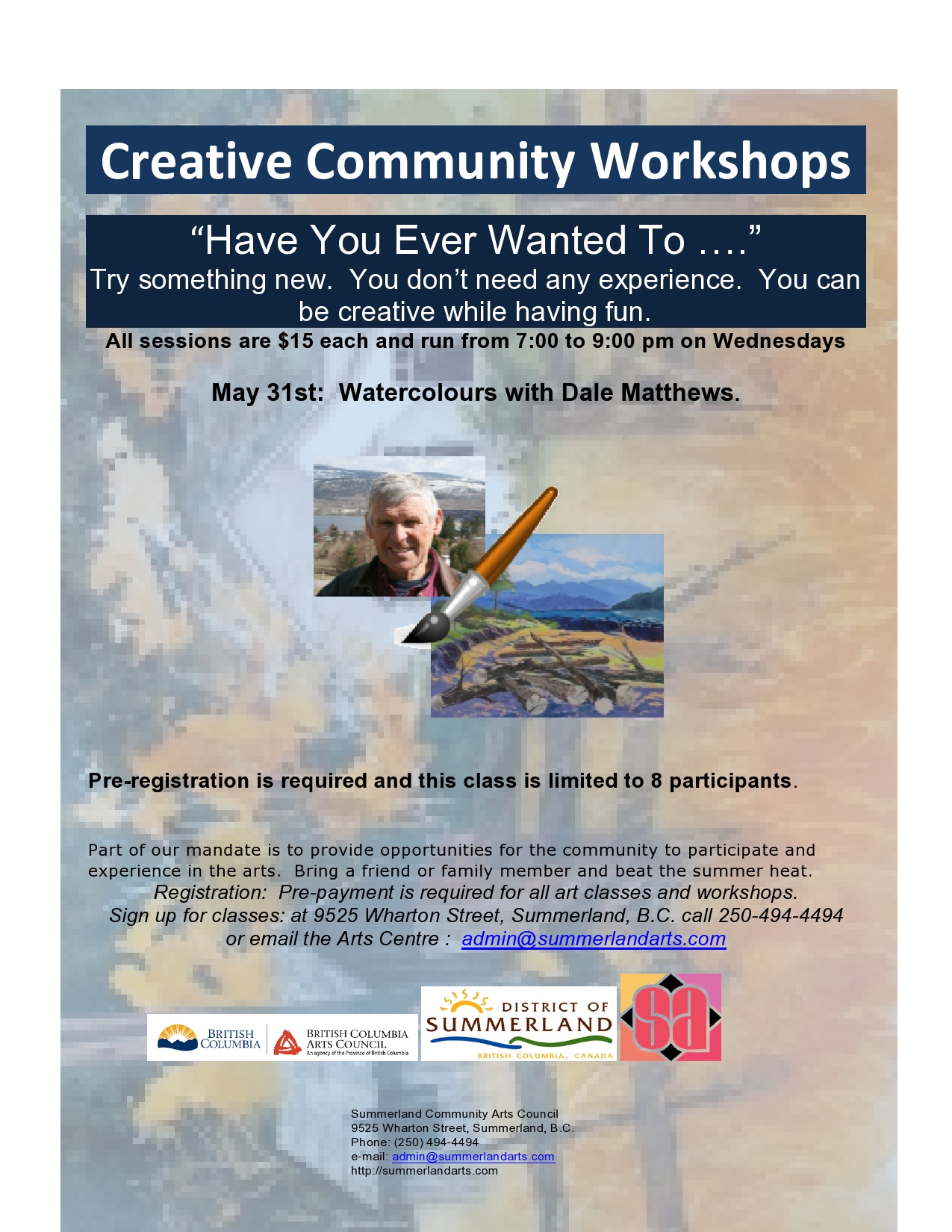 $15 Pre-registration required. Class limited to 8 participants Creative Community Workshops “Have you ever wanted to…..?” Try something new. You don’t need any experience. You can be creative while having fun. All sessions are $15 each and run from 7-9pm on Wednesdays at the Summerland Arts Centre, 9525 Wharton Street.