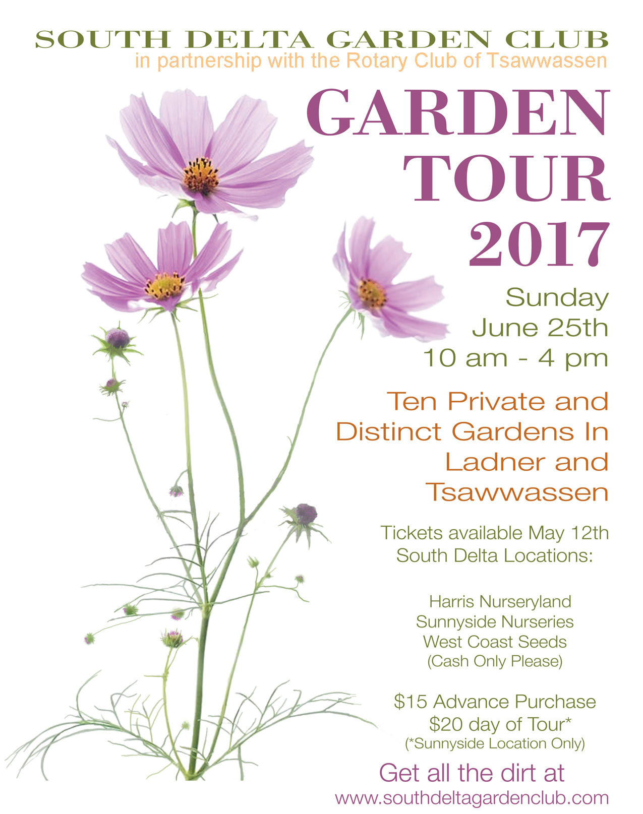 10 amazing gardens in Ladner, Tsawwassen and Boundary Bay. a self guided Tour advance tickets $15 day of Tour $20 Tickets available at Harris Nursery, Sunnyside Nursery and West Coast Seeds