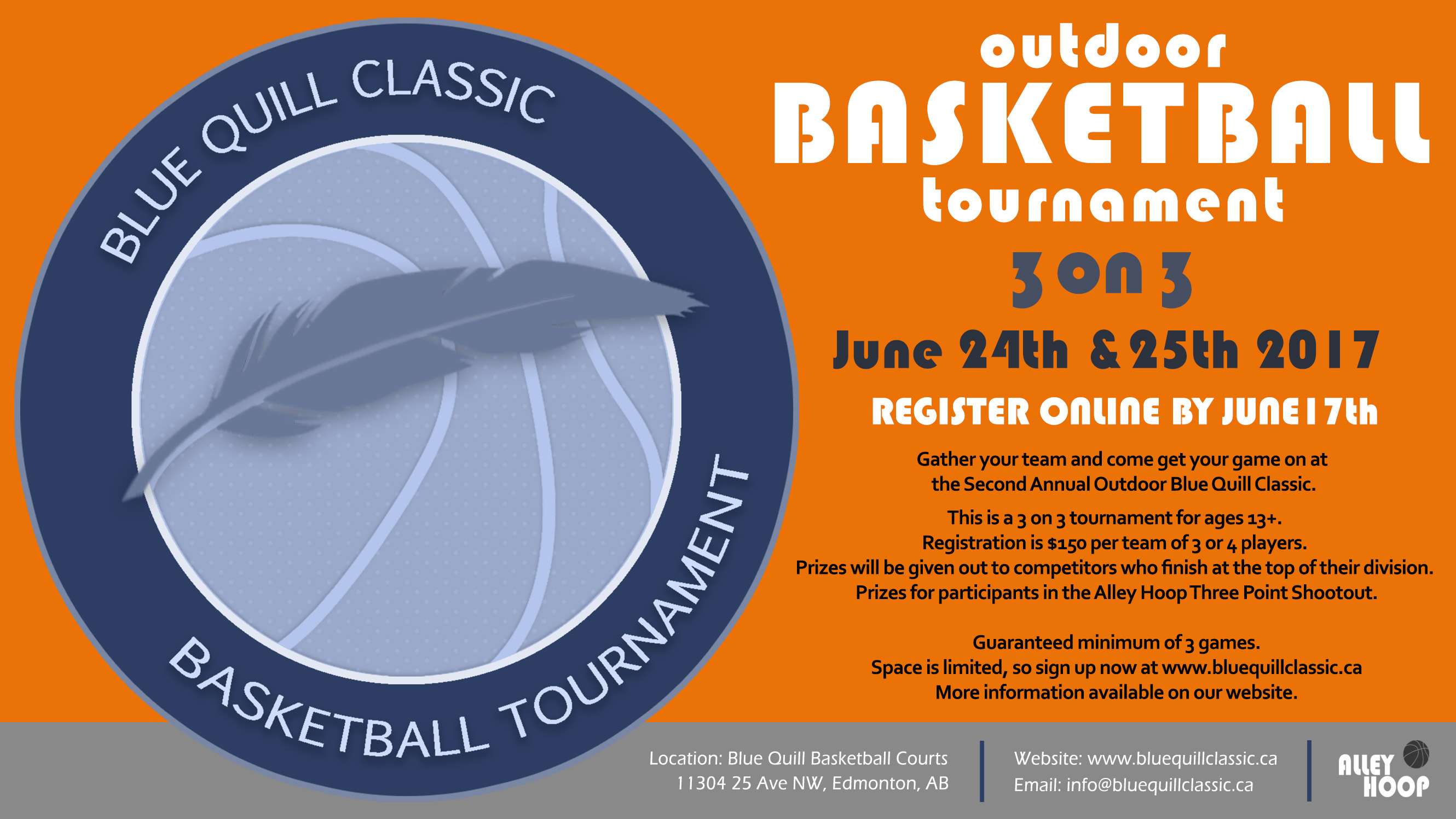his is a 3 on 3 Basketball Tournament Hosted by Alley Hoop to help fundraise for the Blue Quill community basketball courts. Tournament takes place on June 24th & June 25th. The purpose of this event is to raise funds to improve the blue quill community basketball courts by reinvesting the proceeds to things like the resurfacing the court floor, installing new backboards, breakaway rims, chain nets and fence repair. We’ll have music, photographers and a videographer around taking in all the action! So come out and bring your A game! All information and sign ups must go to http://www.bluequillclassic.ca