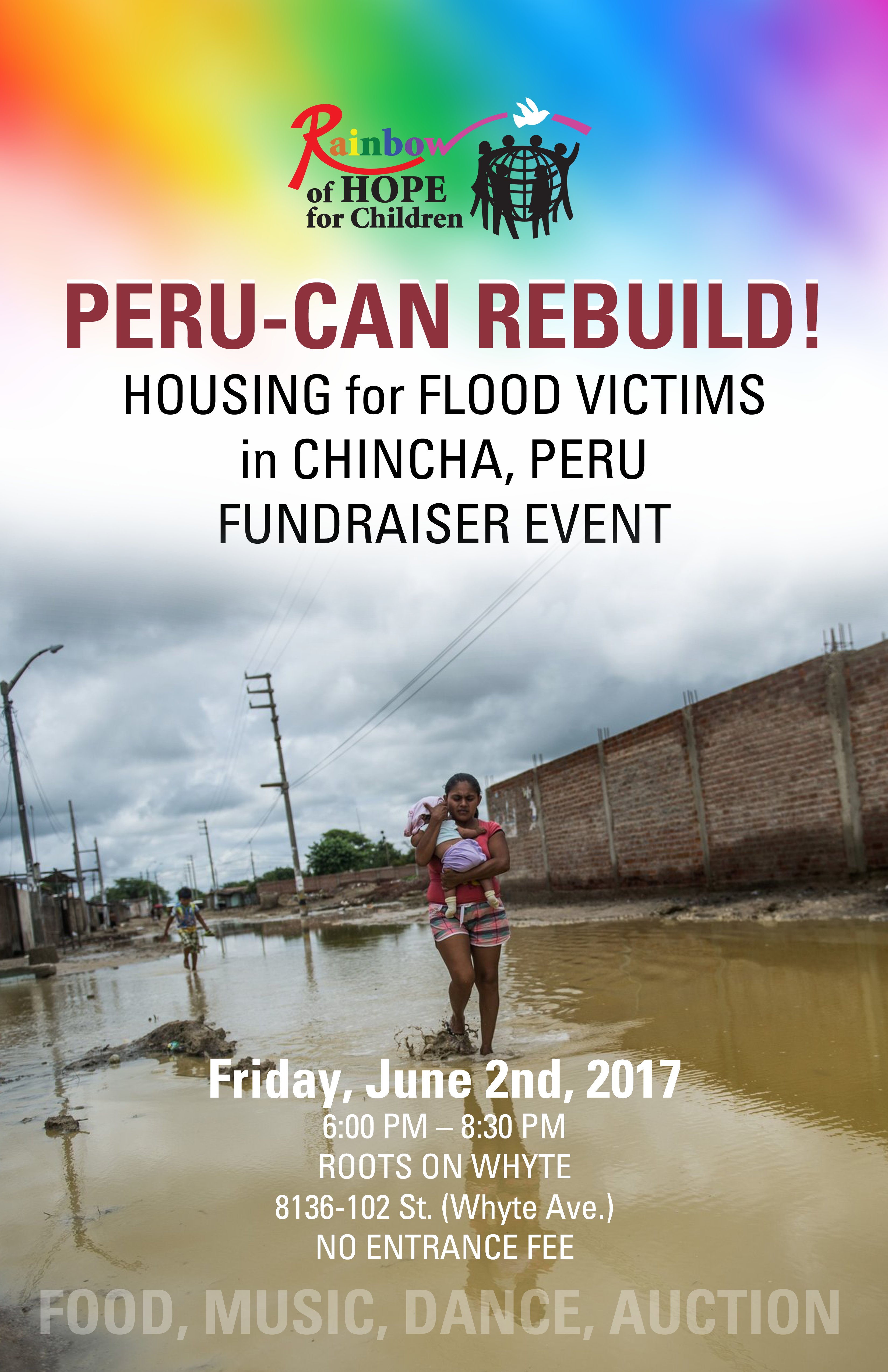 In March severe flooding on the coast of Peru killed over 75 people, injured many more and left millions homeless. Rainbow of Hope for Children and Alberta Based NGO has a long-term project in Chincha Peru where most people are now homeless. With support from the Edmonton Peruvian community and Sombrilla International Development Society, Rainbow of Hope for Children is raising funds to provide housing for the most vulnerable community members. The Peru-Can Rebuild event offers Peruvian food, music, dancing and an auction seeking donations for the project. Free Event. Donations for the cause will be gratefully accepted.