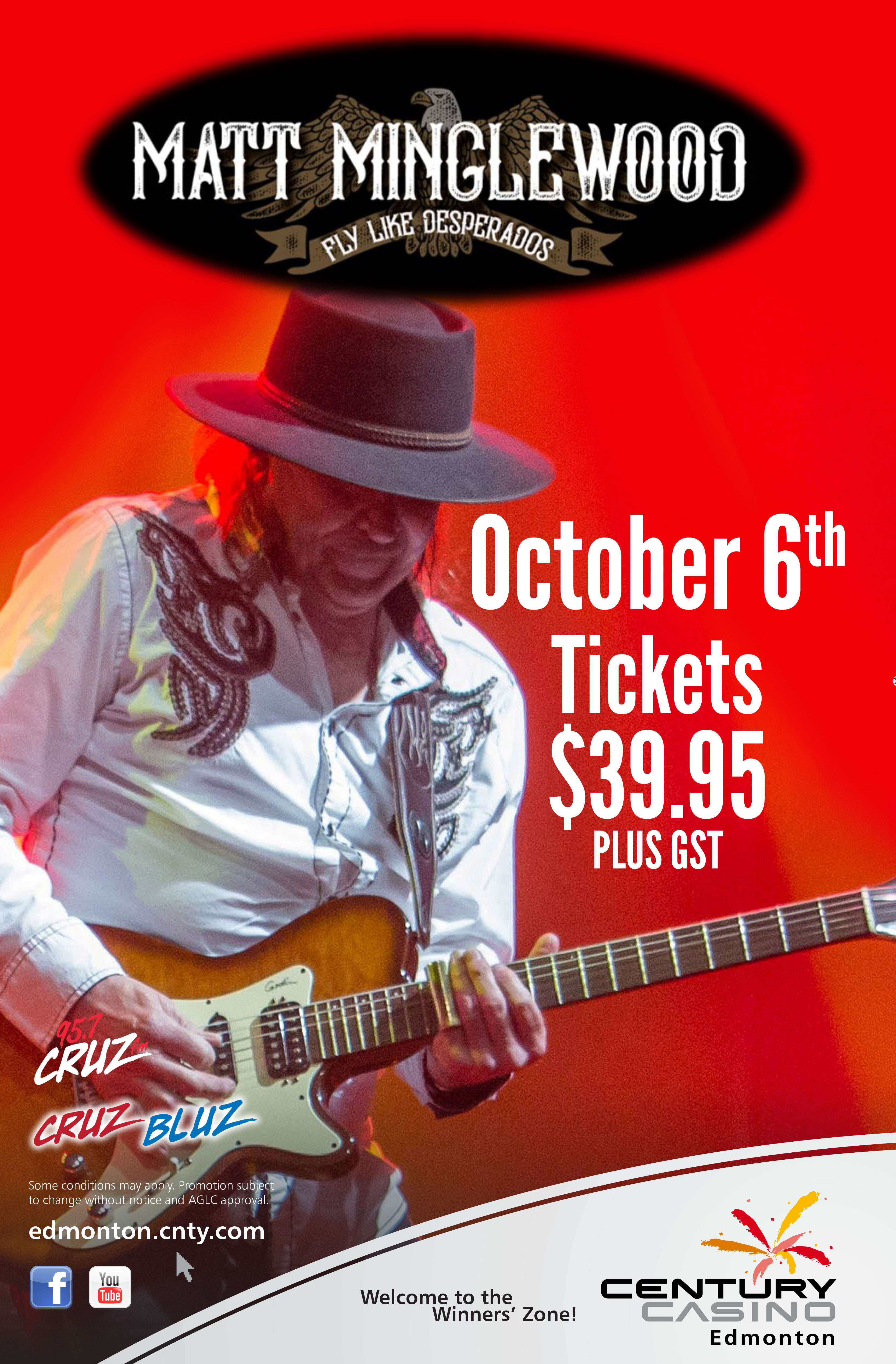 The Matt Minglewood Band are a musical hybrid, a four-member band with one foot steeped in the musical roots of blues and country and the other knee-deep in rock. Minglewood has long been regarded as a musical shapeshifter. The band are masters of improv and genre bending and their constant touring & high octane stage show has earned them the well-deserved reputation of ‘down to earth bearers of good will and good times ’. Minglewood’s diversity & broad audience appeal has made them a fave on the Canadian touring circuit. Featuring such hits as “Livin’ Outside The Law”, “Georgia on a Fast Train”, “Cajun Stars” and “You Win Again”!