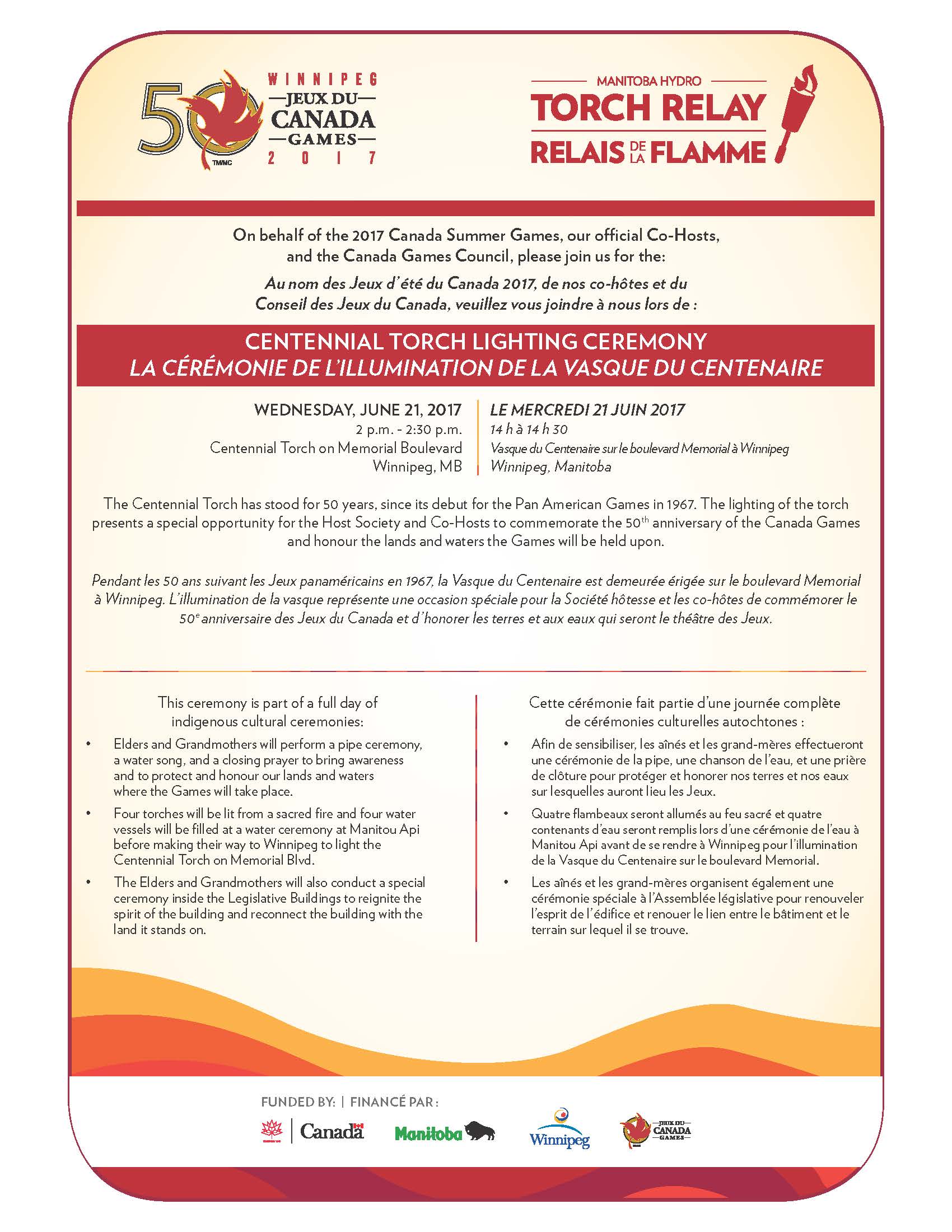 On behalf of the 2017 Canada Summer Games, our official Co-Hosts, and the Canada Games Council, please join us for the Centennial Torch Lighting Ceremony! The Centennial Torch has stood for 50 years, since its debut for the Pan American Games in 1967. The lighting of the torch presents a special opportunity for the Host Society and Co-Hosts to commemorate the 50th anniversary of the Canada Games and honour the lands and waters the Games will be held upon. The ceremony is part of a full day of indigenous cultural ceremonies: – Elders and Grandmothers will perform a pipe ceremony, a water song, and a closing prayer to bring awareness and to protect and honour our lands and waters where the Games will take place. – Four torches will be lit from a sacred fire and four water vessels will be filled at a water ceremony at Manitou Api before making their way to Winnipeg to light the Centennial Torch on Memorial Blvd. – The Elders and Grandmothers will also conduct a special ceremony inside the Legislative Buildings to reignite the spirit of the building and reconnect the building with the land it stands on.
