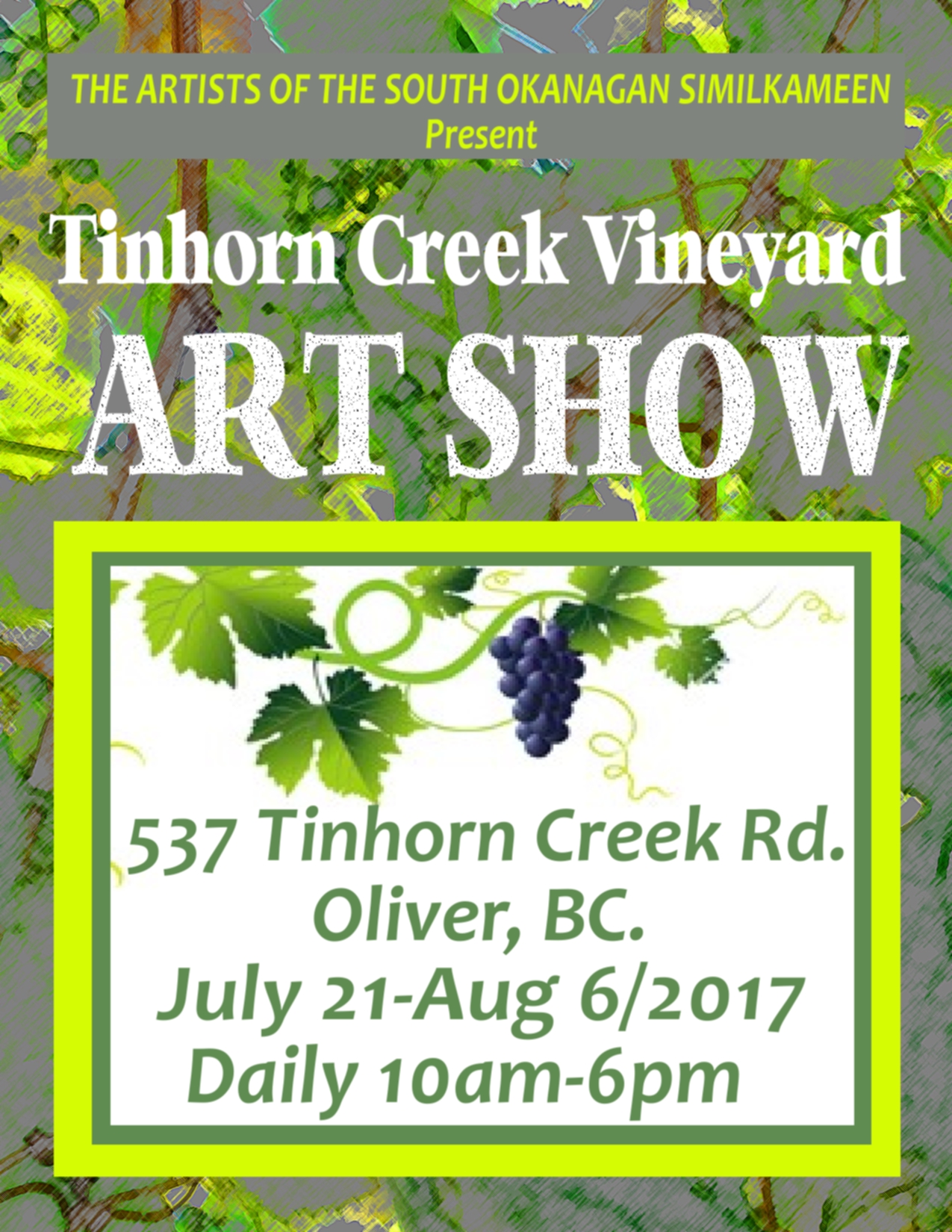 The Artists of the Okanagan-Similkameen will be presenting works of Art at Tinhorn Creek Winery July 21-Aug 6/2017
