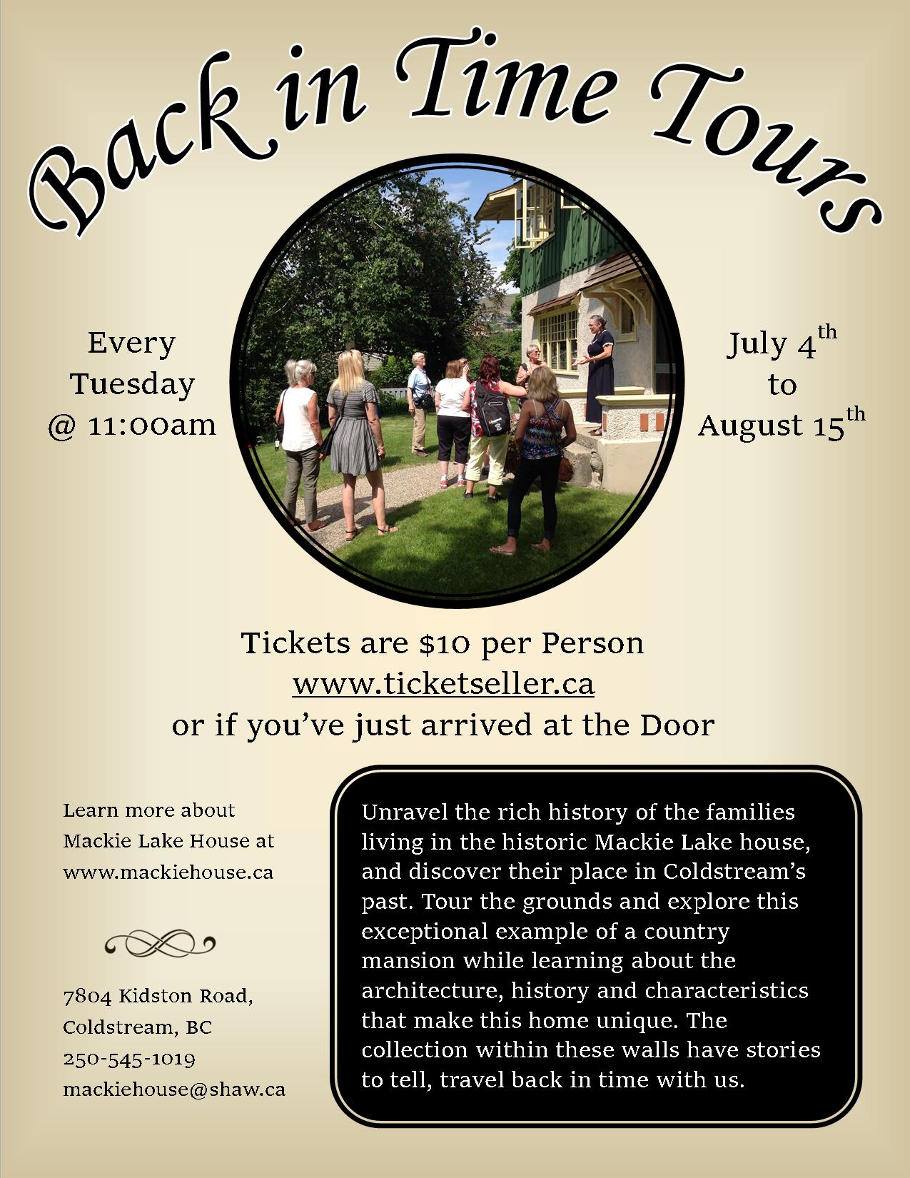 Unravel the rich history of the families living in the historic Mackie Lake house, and discover their place in Coldstream’s past. Tour the grounds and explore this exceptional example of a country mansion while learning about the architecture, history and characteristics that make this home unique. The collection within these walls has a story to tell, travel back in time with us. Tours will start on July 4th and run every Tuesday at 11:00am until August 15th. Tickets are $10 per person and are available now at http://www.ticketseller.ca/1308 or at the door.