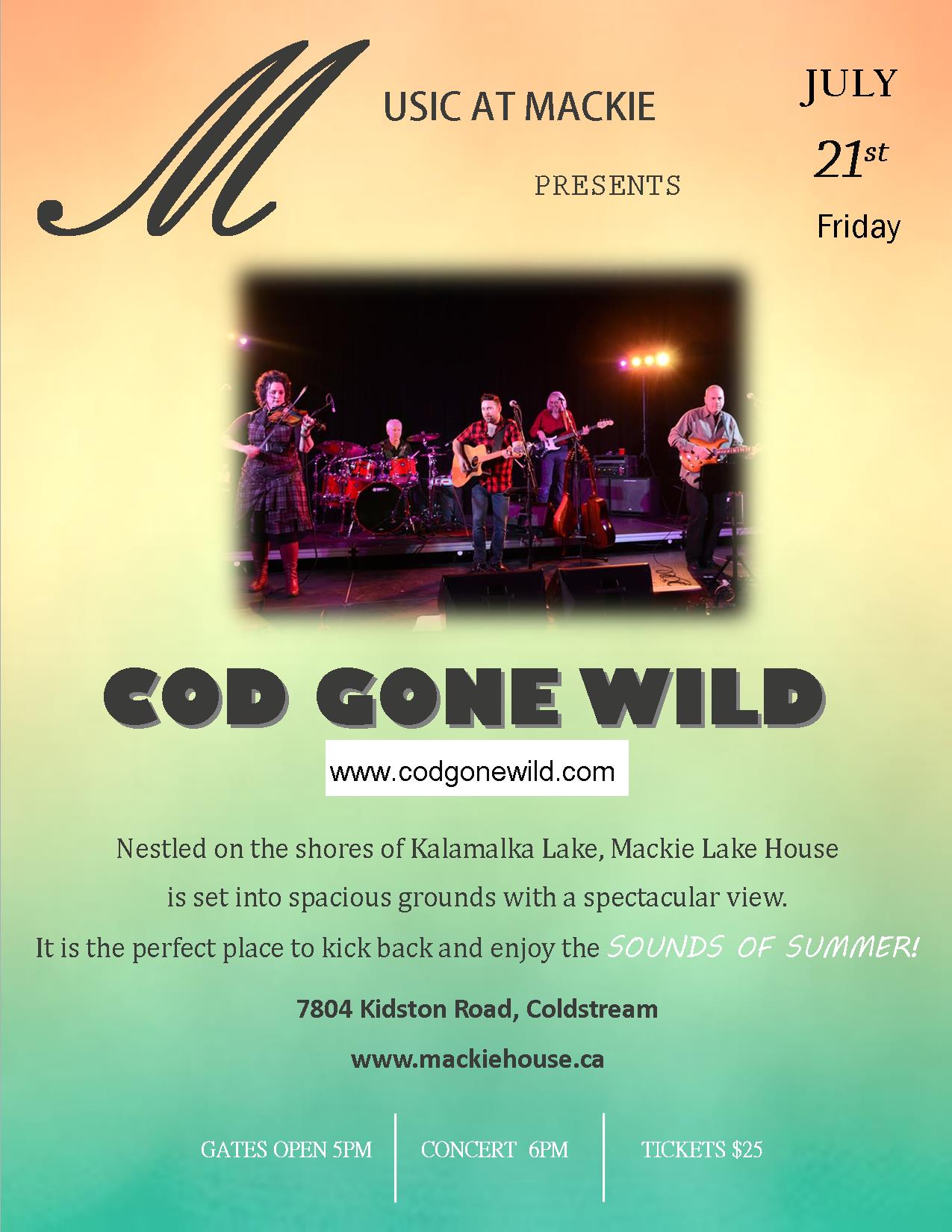 We are excited to welcome back one of our favourite bands, Cod Gone Wild this summer! Based out of BC’s Okanagan Valley since 2009, this Celtic inspired band is focused on giving traditional music a modern edge. Blending the varied talents of five musicians whose classical, folk, rock and jazz backgrounds fuse together to create a dynamic and unique sound that instantly connects and resonates with audiences. Through their uplifting energy and remarkable stage presence, they weave together a tapestry of tales that evoke a nostalgic experience of days gone by. For a magical summer evening come listen to marvelous music on the spacious lawns overlooking Kalamalka Lake. Bring your own lawn chair/blanket and picnic dinner – or if you prefer purchase a picnic dinner with your ticket and dine “al fresco” at the historic Mackie Lake House. Gates open at 5:00pm; music begins at 6:00pm. Concert tickets are $25 per person; children under the age of 12 are free! Tickets for picnic dinners with concert are $50. Beer and wine are available at our cash bar. The picnic dinner option is: Ricotta and spinach calzones, seasonal and local crudités and Okanagan raspberry cheesecakes. Please note that picnic dinners must be purchased by Monday, June 19th. For any dietary concerns please contact us at mackiehouse@shaw.ca Join us for an evening filled with great views, tasty food, and amazing music!