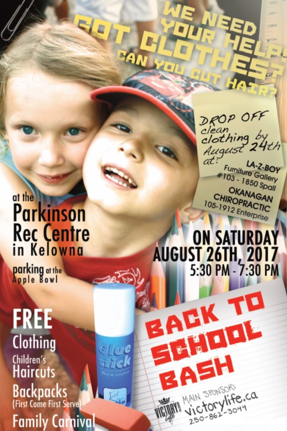 Victory Life hosts the 14th Annual Free Back to School Bash Free Backpacks Free Clothing Free Haircuts Hot dogs Prizes & Gifts Children’s Activities & Live Entertainment Got Clothes? Drop off good quality clean clothing to LaZBoy Furniture or Okanagan Chiropractic Volunteer or Donate: http://www.victorylife.ca or 250-862-3044