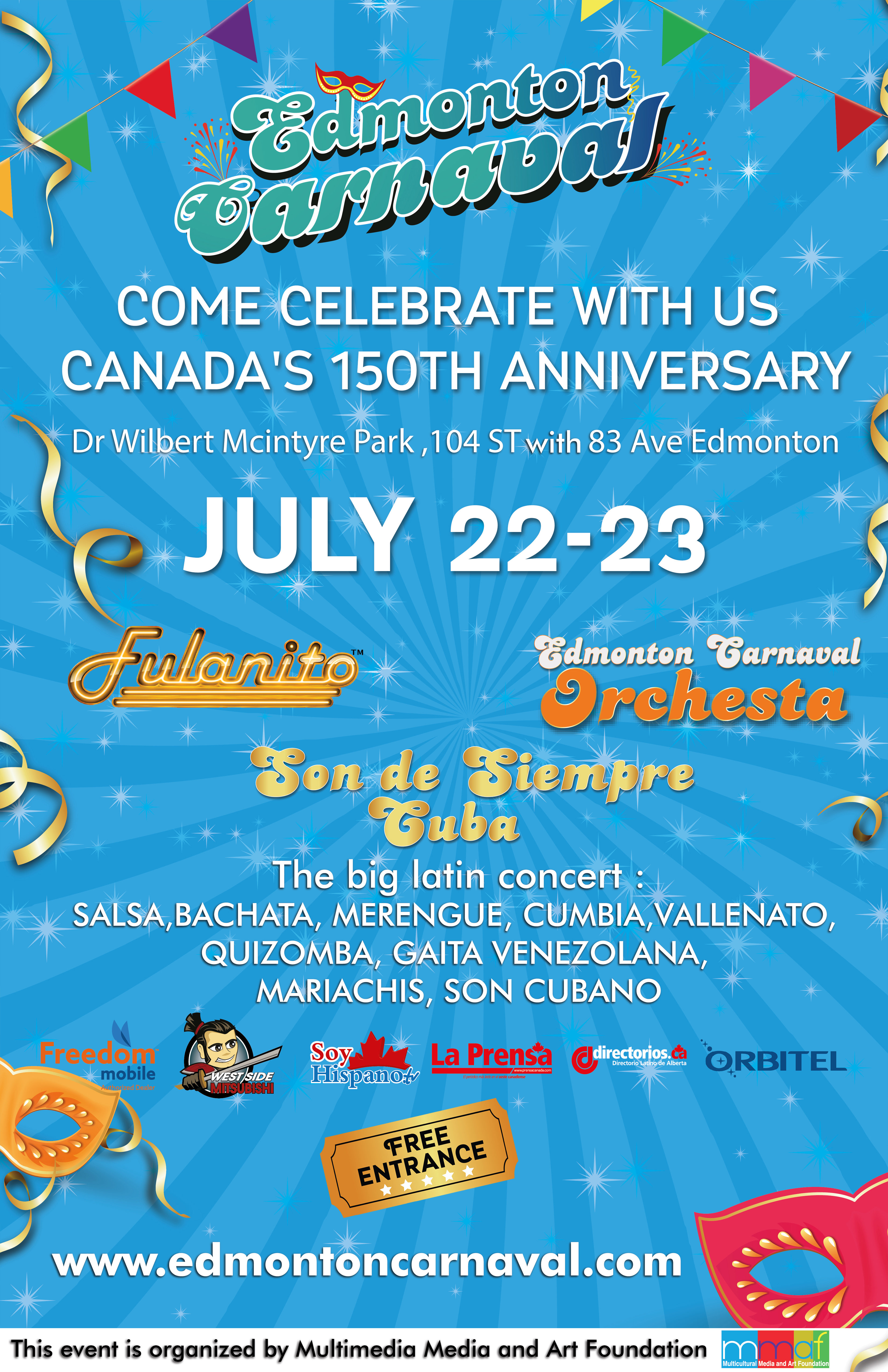 Edmonton Carnaval Come Celebrate With us Canada’s 150th Anniversary, at Edmonton Carnaval, Edmonton biggest Latin Event. FREE EVENT. With in this grand event, there will be 14 hours of live music, 40 professional dance groups, 2 International group, 150 volunteers, 2 tons of food, 15 food vendors. Salsa, Merengue, Bachata, Quizomba, Cumbia, Vallenato, Mariachi, Orchestra, Latin Rock. Mexican food and others.