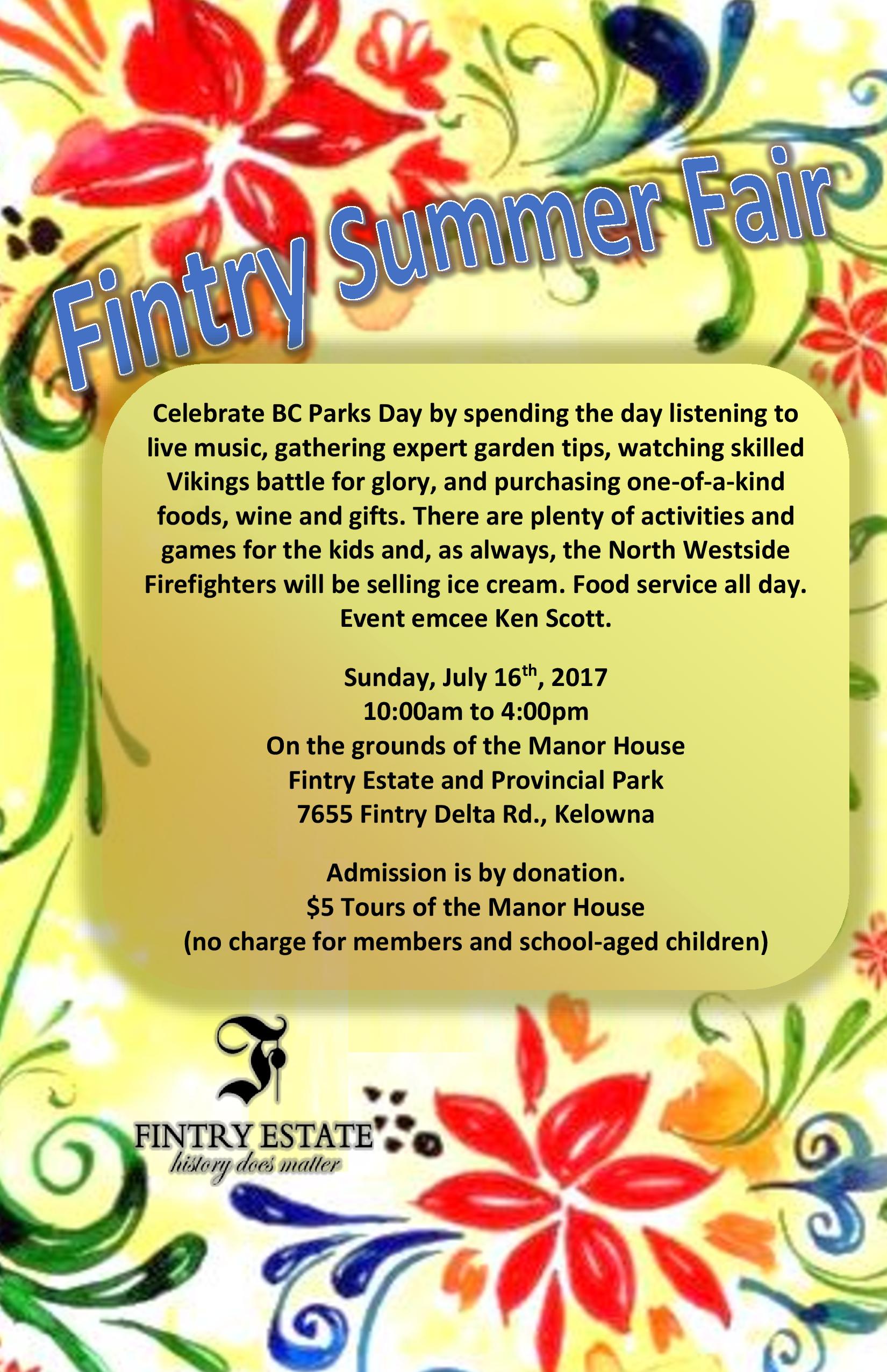 Celebrate BC Parks Day by spending the day listening to live music, gathering expert garden tips, watching skilled Vikings battle for glory, and purchasing one-of-a-kind foods, wine and gifts. There are plenty of activities and games for the kids and, as always, the North Westside Firefighters will be selling ice cream. Food service all day. Event emcee Ken Scott. Admission is by donation. $5 Tours of the Manor House (no charge for Fintry members and school-aged children) For more information contact: caballero@shaw.ca