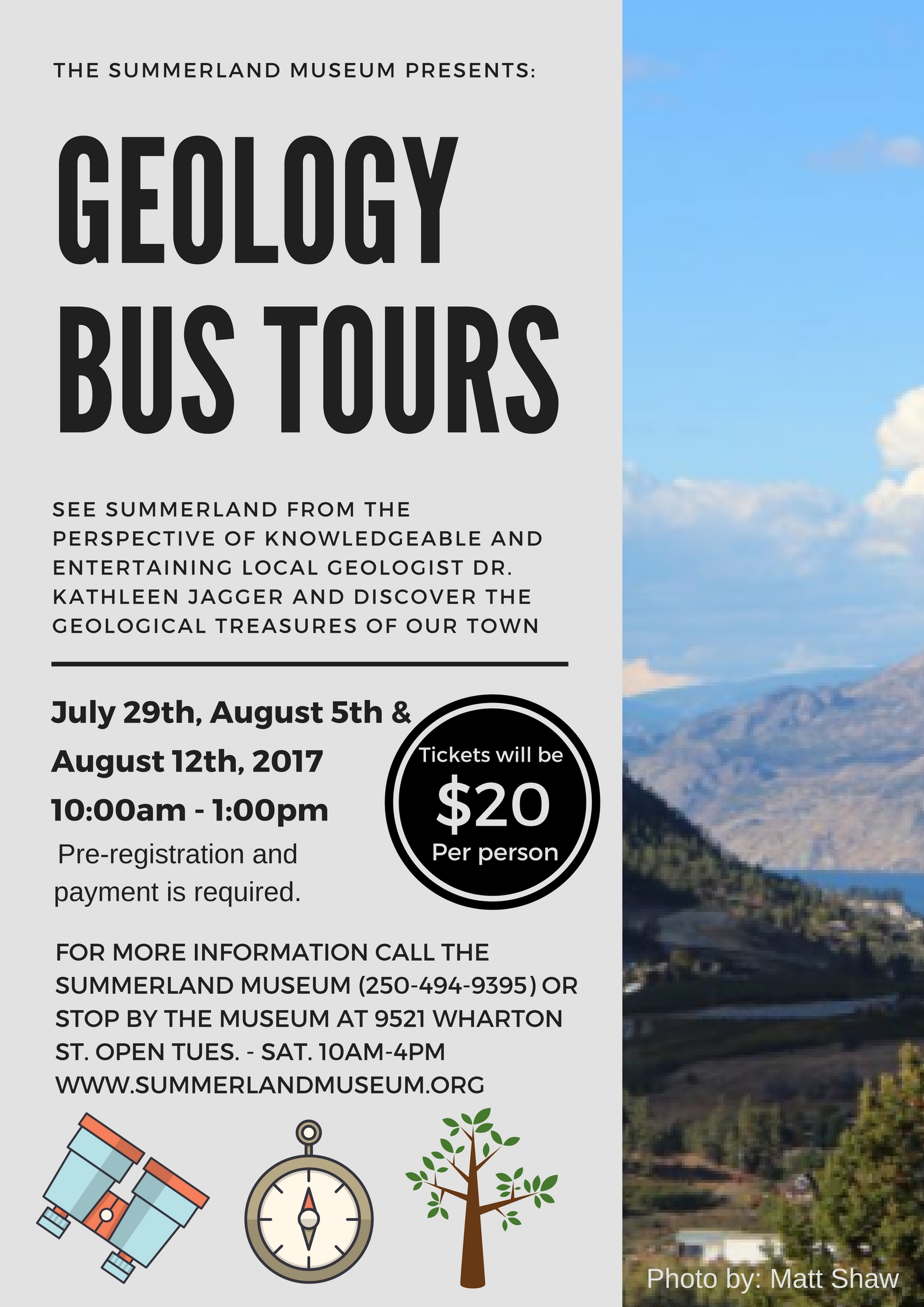 Looking for an educational and fun way to spend a Saturday this Summer? A way to see Summerland from a different perspective? On July 29, August 5 and August 12th, the Summerland Museum will once again be having Geology Bus Tours! Tours will be led by knowledgeable and entertaining local geologist Dr. Kathleen Jagger. Tour will include visiting various geological sites of Summerland via bus as well as a few short and very easy hikes. All ages welcome! Tickets are limited so be sure to stop by the museum and sign up!