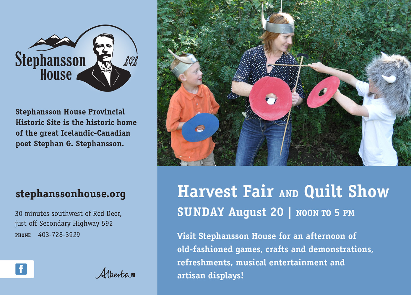 As Summer ends, visit Stephansson House for an afternoon of fun and games for the whole family. Enjoy simple refreshments, musical entertainment, and demonstrations while browsing the wares of local artisans, including a cornucopia of quilts by the Spruce View Quilters! Kids of all ages are invited to bring their pennies (or get them from us) and participate in our old-fashioned carnival games and crafts. This year’s vendors include Bee Right Natural Honey, Tanglewood Soaps, Muddy Otter Pottery, Nuts About Chocolate, Happy Hippo, Boxxlife, and more! Regular Admission rates apply WE ARE A CASH ONLY SITE
