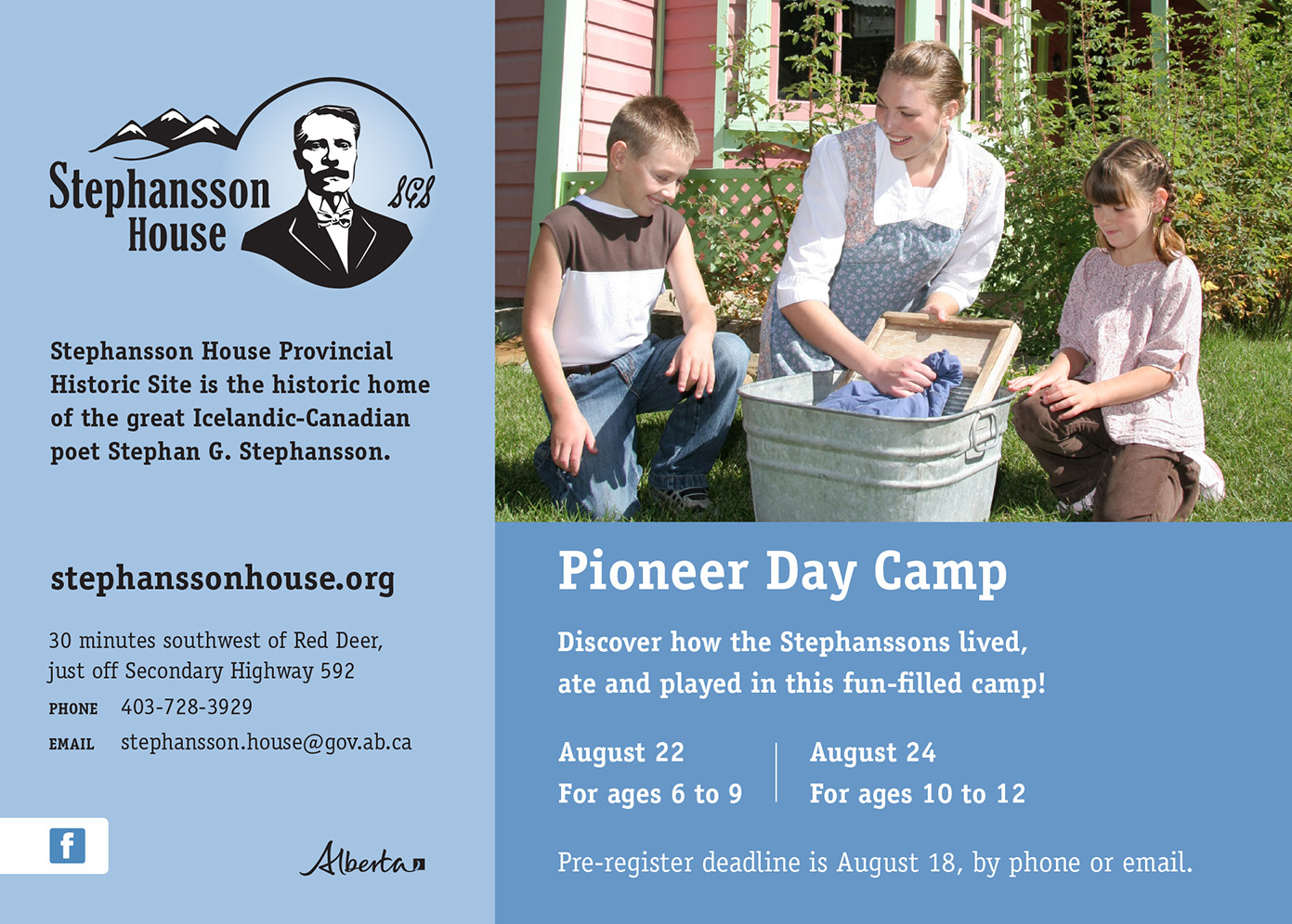 Discover how the Stephanssons lived, ate and played in this fun-filled camp! Join us for historical games, try your hand at various homestead chores, make astarbollur, practice your handwriting with old-fashioned pen and ink, and more! There will be 2 camps offered: • August 22, 2017 from 10:00am-1:00pm for children aged 6-9yo. Cost $15 per child. • August 24, 2017 from 10:00am-3:00pm for children aged 10-12yo. Cost $20 per child. PRE-REGISTRATION REQUIRED! Registration deadline is August 18, 2017 at 4:30pm. Phone us at 403.728.3929 or email us at Stephansson.House@gov.ab.ca.