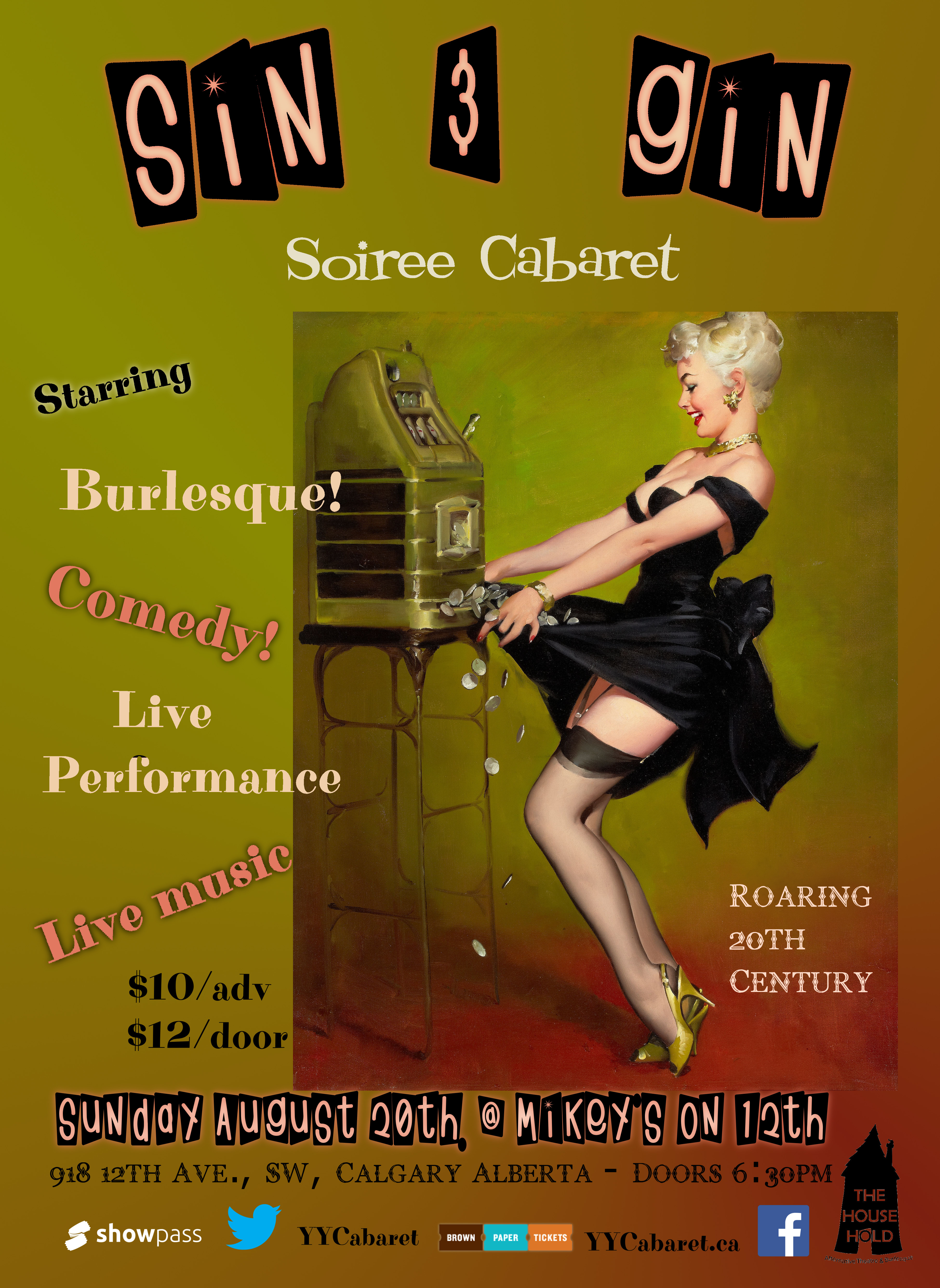 This month’s Sin & Gin! Filled with Comedy, Music, Dance, Burlesque, Cabaret and more! And what better than to give a bow to more than a millenium of cabaret that has paved this path! And a path into the future! This month is ‘Roaring 20th Century’! Starring- Manhattan Wilde – Guest Host Mama Diva Dawn – Vaudeville Dance Katra Corbeau – Burlesque Rebelle leReve – Burlesque Matt Foster – Comedy Minerva – Cabaret Bang Tango and El chameleon -Burlesque / Theatre Dance Anita Vice – Burlesque Mae Fyre – Performance Burlesque Sassy Brass – Guest Kitten and Ben Rose as Guest Band! Sunday August 20th, 2017 – doors 6:30 / show 7pm 918 12th Ave, SW, Calgary AB – Mikey’s on 1th $10 adv/RVSP – http://sinandginroaring20century.bpt.me/ – https://www.myshowpass.com/sin-gin-soiree-cabaret-roaring-20th-century/ $12 door