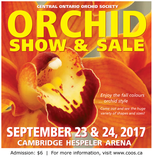 The annual COOS Orchid Show and Sale will be held at the Hespeler Memorial Arena, 640 Ellis Road, Cambridge, N3C 4K2 on September 23 and 24 2017. On Saturday, the show is open from 11 am to 5 pm, and on Sunday from 9 am to 5 pm. COOS, which covers primarily Kitchener, Waterloo, Cambridge and Guelph, is a local non-profit organization of orchid enthusiasts, from novice to expert! Orchids are one of the largest families of flowering plants in the world, with up to 26,000 accepted species across 880 genera: more than double the number of bird species, and more than four times the number of mammal species globally. In addition, there are millions of hybrids! Orchids can be found on all continents except Antarctica: from the frozen tundra of Alaska to the rainforests of Brazil, Indonesia, and the Congo. Many will be on display and even more for sale at the COOS show this fall. COOS meets monthly throughout the year in Kitchener. These meetings include invited speakers, who give talks on all aspects of orchids, member orchid sales, a show table, and orchid growing supplies. Experienced members are always willing to share tips, tricks, and advice on orchid care and cultivation. For more detailed information about COOS and the show, please check out: http://www.coos.ca