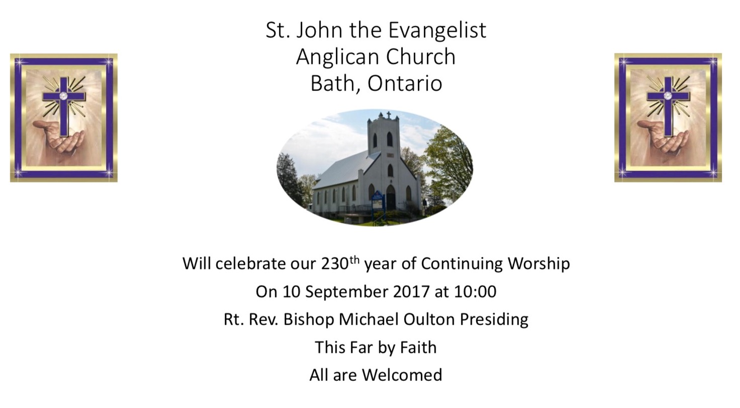 St. John the Evangelist Anglican Church in Bath is celebrating 230 years of continuing worship on Sept. 10, 2017 at 10 am with the Rt. Rev. Bishop Michael Oulton presiding.