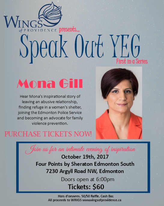 Join us for an evening of inspiration! Hear Edmonton local guest speaker Mona Gill’s inspirational story of leaving an abusive relationship, finding refuge in an Edmonton women’s shelter, joining the Edmonton Police Service and becoming an advocate for family violence prevention. Delicious Hors D’oeuvres, cash bar, 50/50 raffle, centerpiece draw. ALL proceeds to WINGS of Providence – a long term shelter for women and their children who have experienced family violence.