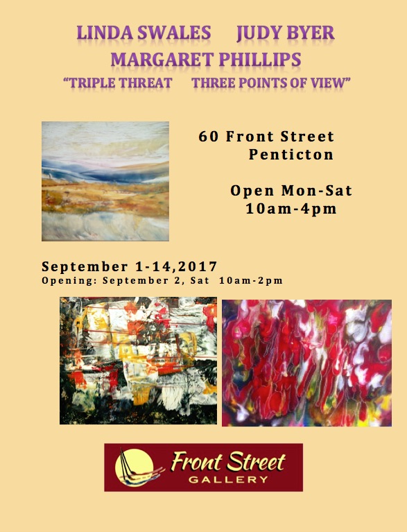 These three friends have studied, worked and shown together for fifteen years. Their love and joy in the encaustic medium has provided them with endless avenues to explore. Each artist works from a slightly different perspective resulting in varied and interesting styles. They are active members of the Federation of Canadian Artists in Penticton and various art local art groups. Please join them at the “vernissage” Artist Opening Event on Saturday, Sept 2, from 10am-2pm.