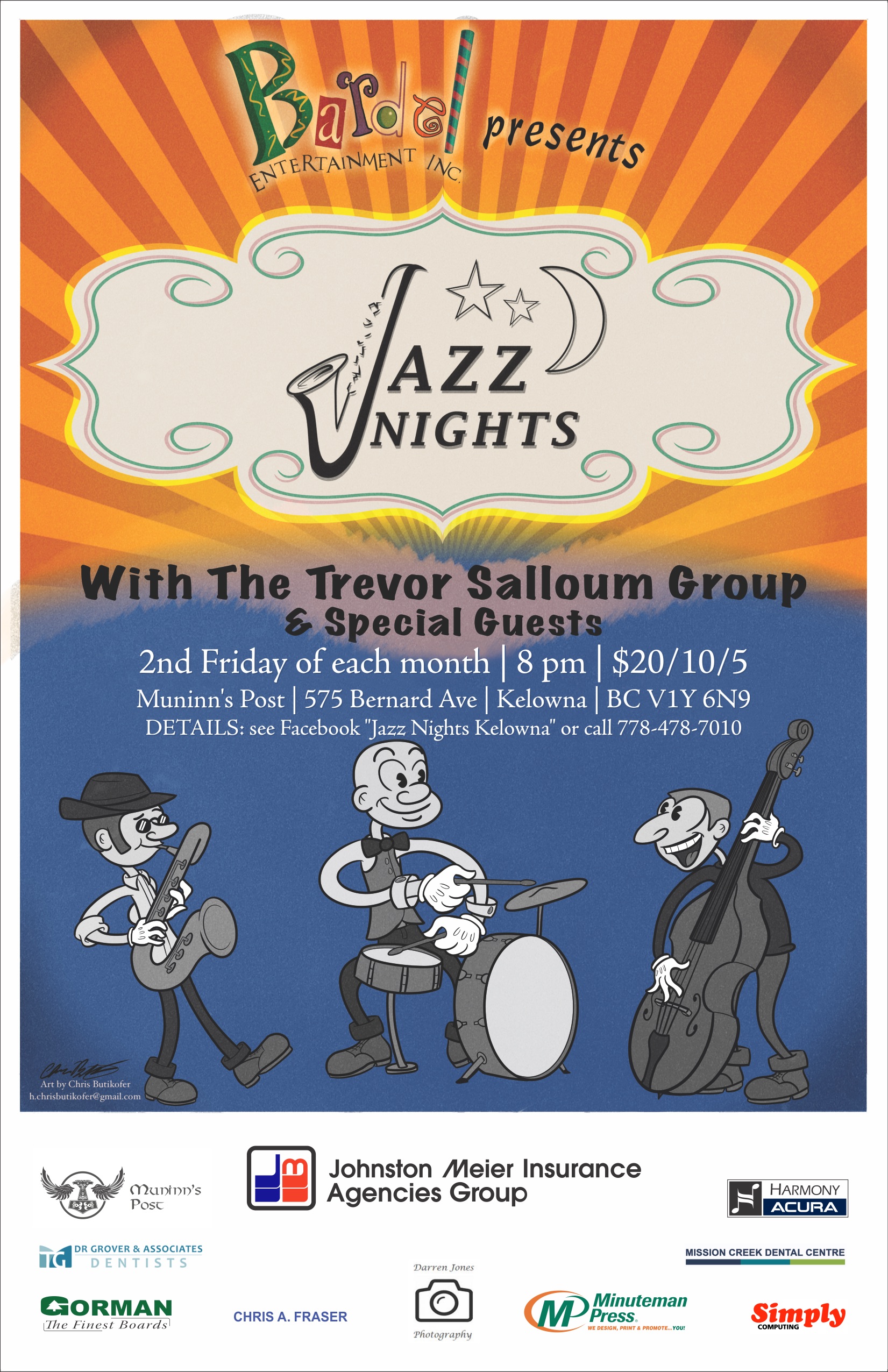 Bartel Entertainment presents Jazz Nights with The Trevor Salloum Group and Special Guests: Sept.8 Bob Rogers Oct.13 Laura Crema Nov.10 Kinga Heming Dec.8 Neil Fraser/Andrew Smith Jan. 12 Craig Thomson Feb.9 Amanda Morazain Second Friday of the month 8pm $10/5 Students (Laura Crema $20) Muninn’s Post 575 Bernard Ave, Kelowna, BC V1Y 6N9 778-478-7010 Web Site: https://jazznightskelowna.wordpress.com/ FB: https://www.facebook.com/jazznightskelowna/ Venue: http://www.muninnspost.com/