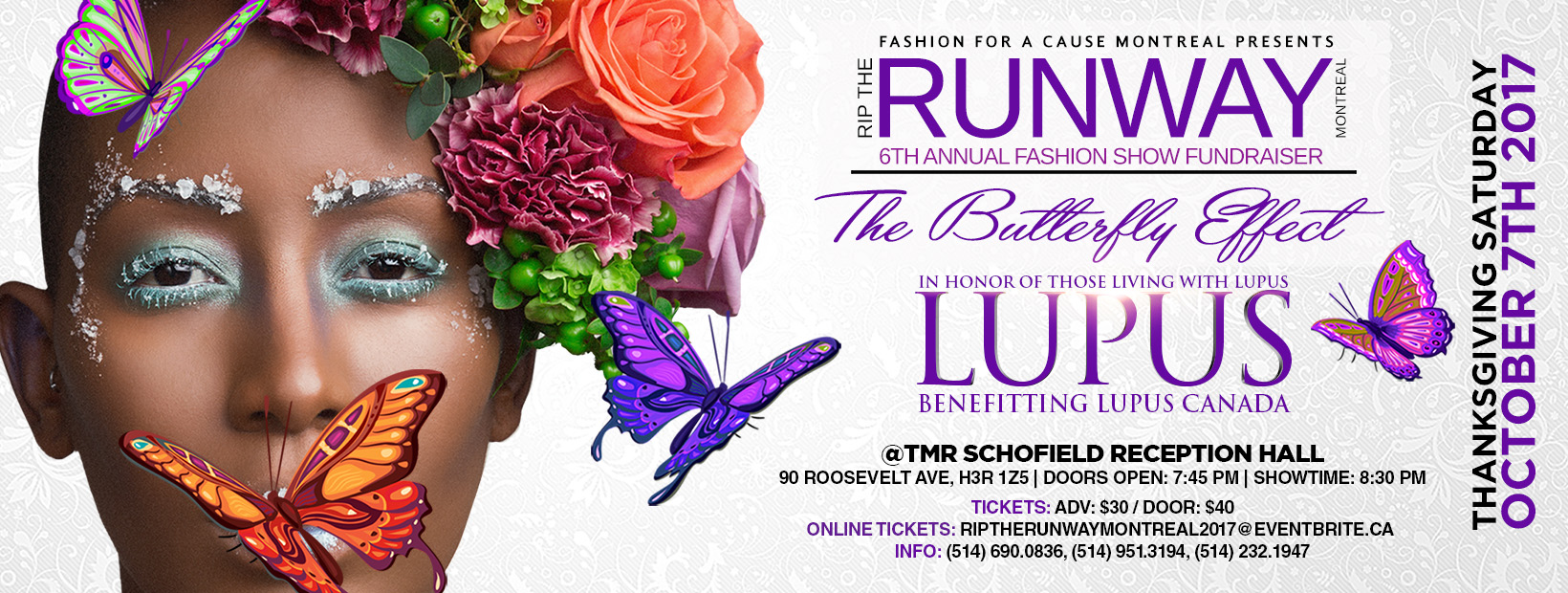 RIP THE RUNWAY MONTREAL 2017 6th Annual Fashion Show Fundraiser Presents: “THE BUTTERFLY EFFECT”, benefiting Lupus Canada. This Annual Sold Out Event Raises Awareness to a different illness each year that isn’t getting enough recognition. Lupus is under-funded and under recognized and is life-threatening and life-altering, that can target any tissue or organ of the body. Prepare yourself for a night of Fashion Forward Designers, Diverse Cast of Models, Entertaining Performances & Suprise Giveaways while learning more about Lupus than when you walked in!!! $30 Advance Online Tickets Available @ http://www.eventbrite.ca”RIP THE RUNWAY MONTREAL 2017″ $40 – DOOR