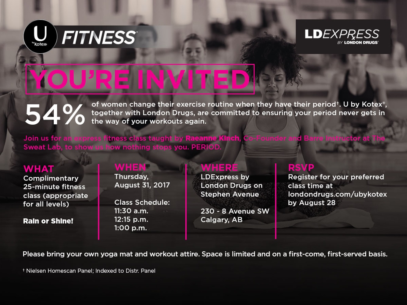 You’re invited! 54% of women change their exercise routine when they have their period. U by Kotex, together with London Drugs, are committed to ensuring your period never gets in the way of your workouts again. Join us for an express fitness class taught by Raeanne Kinch, Co-Founder and Barre Instructor at The Sweat Lab, to show us how nothing stops you. PERIOD. What: Complimentary 25-minute fitness class (appropriate for all levels). Rain or shine! Class Schedule: 11:30am, 12:15pm, 1:00pm Register for your preferred class time at: http://www.londondrugs.com/ubykotex.html Space is limited and on a first-come, first-served basis. Please bring your own yoga mat and workout attire.