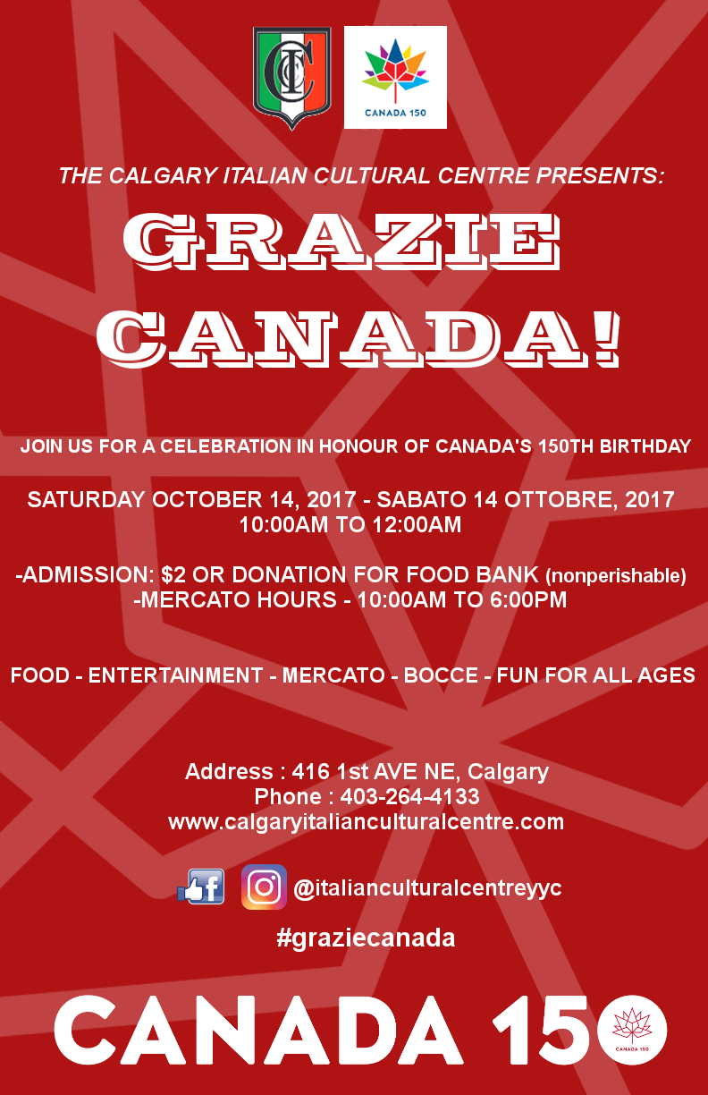 Grazie Canada is a thank you to Canada in honor of her 150th birthday. We will be hosting a mercato, food, fun and entertainment throughout the day and night.