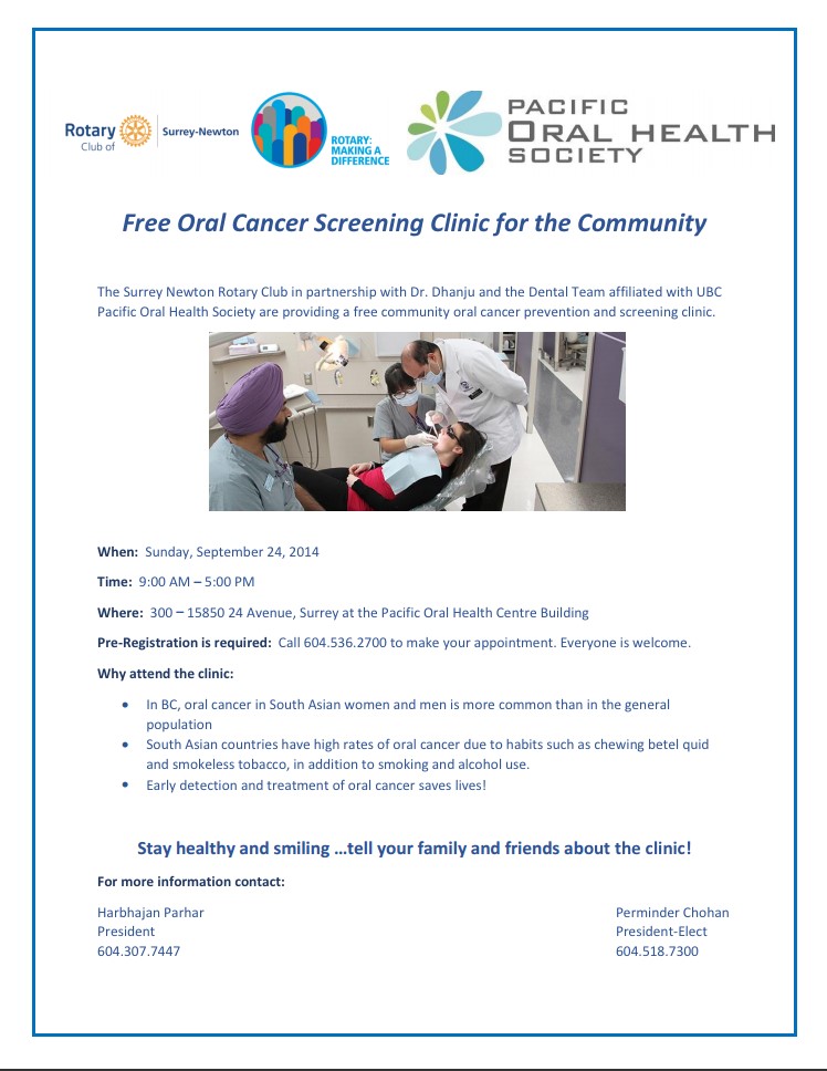Free Oral Cancer Screening Clinic for the Community The Surrey Newton Rotary Club in partnership with Dr. Dhanju and the Dental Team affiliated with UBC Pacific Oral Health Society are providing a free community oral cancer prevention and screening clinic. Event summary: The goal of the clinic is to help reduce the barriers to oral cancer screening and support the prevention and early detection or oral cancer and pre-cancer. Last year, this event had been a great success as over 260 people pre-registered for the clinic and over 200 patients were examined by the dental team. The data collected by the Pacific Oral Health Society (POHS), indicated that 20 people were found to be at high risk of having oral cancer and 5 cases showed positive signs for oral cancer. Our hope is to reach more people this year, and help save as many lives as we can with early detection. When: Sunday, September 24, 2014 Time: 9:00 AM – 5:00 PM Where: 300 – 15850 24 Avenue, Surrey at the Pacific Oral Health Centre Building Pre-Registration is required: Call 604.536.2700 to make your appointment. Everyone is welcome. Why attend the clinic: • In BC, oral cancer in South Asian women and men is more common than in the general population • South Asian countries have high rates of oral cancer due to habits such as chewing betel quid and smokeless tobacco, in addition to smoking and alcohol use. • Early detection and treatment of oral cancer saves lives! Stay healthy and smiling …tell your family and friends about the clinic! For more information contact: Harbhajan Parhar Perminder Chohan President President-Elect 604.307.7447 604.518.7300