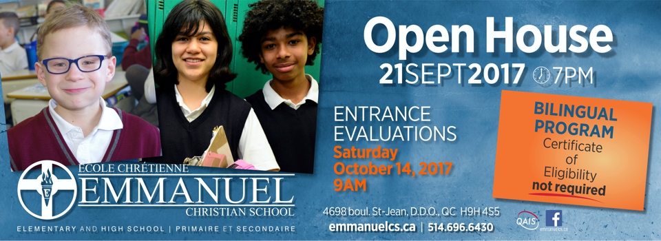 Come visit us at our annual Open House on Thursday, September 21st at 7pm. Emmanuel offers a bilingual program from Kindergarten to Secondary 5. Following a general presentation, our High school guides will be happy to introduce you to our programs. Ask us about arts, music, missions, sports, robotics and more! NEW: Certificates of Eligibility to English Education are not required.