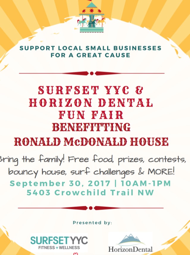 SURFSET YYC and HORIZON DENTAL are hosting a Fun Fair to raise money for the Ronald McDonald House on September 30th at 10 am to 1 pm in the parking lot of our plaza (5403 Crowchild Trail NW).. Bring the kids to have fun with the bouncy houses, surf board challenges, face painters, balloon makers, free food, and more! We will accept donations to the Ronald MacDonald House at the event and online at https://give.rmhcsca.org/funfair. Don’t miss out on this fun event and worthy cause!