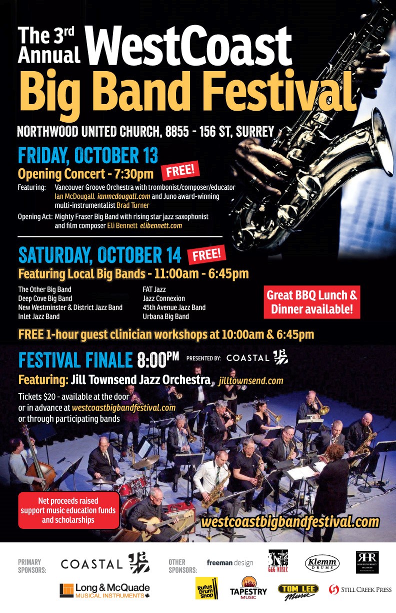 Festival of big band jazz! FREE Friday night Opening Concert, a full Saturday of FREE big band jazz performances by local groups in the Lower Mainland and Fraser Valley, accompanied by FREE instrumental clinic workshops by professional jazz musicians. Then treat yourself to an evening of amazing musicianship and big band jazz from the fabulously hip and swinging Jill Townsend Jazz Orchestra in our evening Festival Finale! Tickets $20 – available at the door or in advance at westcoastbigbandfestival.com or through participating bands