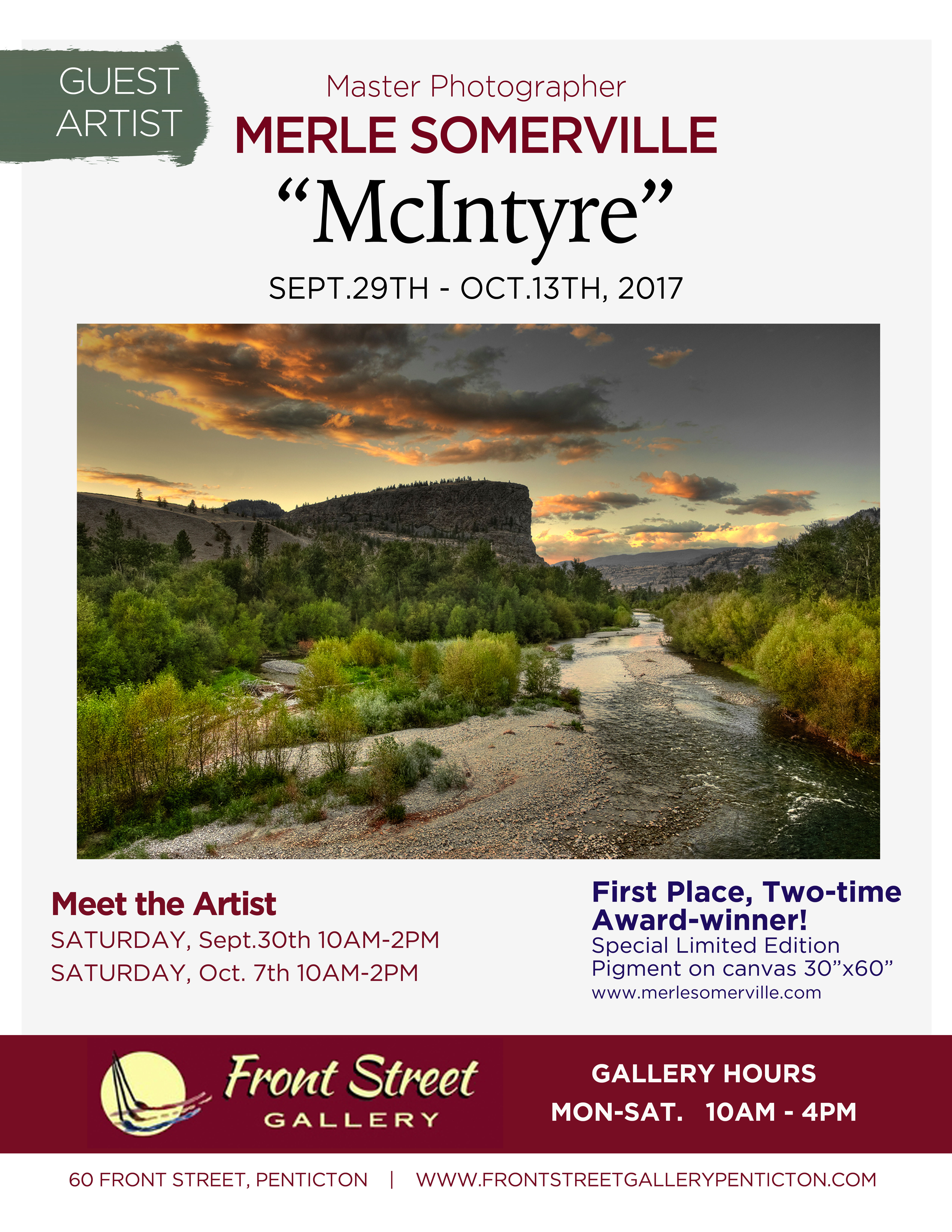 We are delighted to welcome Merle to our gallery again with his ONE large 30″ x 60″ canvas of “McIntyre”, which is a legend in the Okanagan Valley, and one of 4 ‘Must sees’ on Trip Advisor. It has been a multiple Award Winner both locally and Internationally, Best in Show and People’s Choice. If you have never seen McIntyre this is a stunning piece. Merle has been photographing landscapes for over thirty years. His passion for finding the perfect image has led him to photographing more than one hundred British Columbia parks and over thirty parks in the United States. He has scouted and photographically documented locations in Australia, Central America, the Mediterranean and the South Pacific. Highly educated and praised, Merle holds a Canadian Master’s in Photography as well as an American Master’s in Photography, one of only 15 Canadians to receive this coveted honour. His many award winning sharp detailed images have been published extensively and exhibited. Asking him what matters most for him in considering his artwork he says, “No greater reward exists for me than to produce a photograph that expresses my thoughts and emotions—and to have those felt and understood by someone else.” Please join Merle on Saturday, September 30 and October 7, 2017 from 10am-2pm