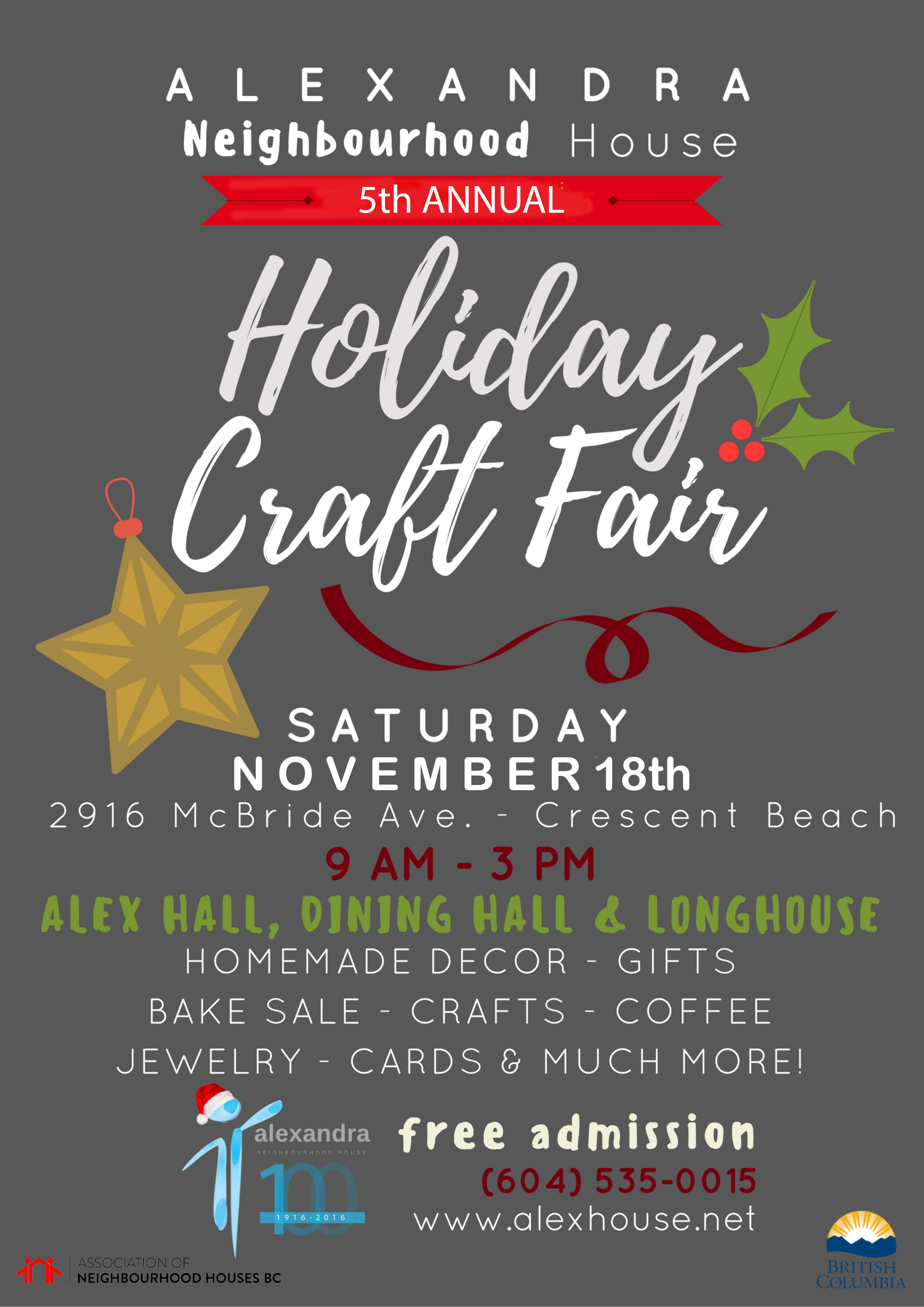 Come down and join us in Crescent Beach for the Alexandra Neighbourhood House’s 5th Annual Craft Fair with a great mix of artists, crafters, vendors, etc. FREE ADMISSION. Over 40 tables to check out. Perfect time for holiday shopping.