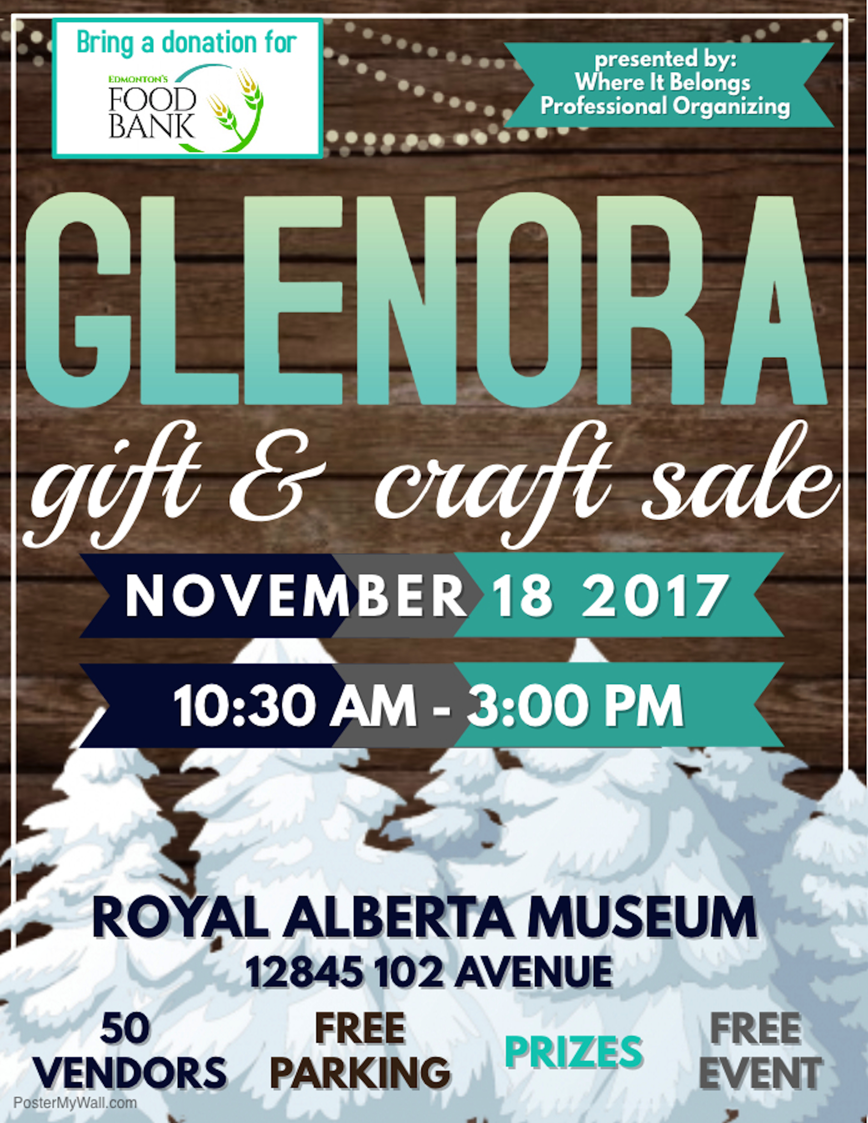 4th Annual Glenora Gift and Craft Sale, 2nd at this location Where It Belongs Professional Organizing is pleased to present another great sale at the beautiful historical and former Royal Alberta Museum. This year shop local for Christmas and support 50+ local vendors, focusing on 80% handmade/local crafters. Vendors are selected based on the diversity and uniqueness of their skill and trade. Bring the gift of a non-perishable food donation to the Gift and Craft Sale and help ensure everybody will enjoy a meal over the holidays. Coffee, snacks for sale. Children welcome – activity table will be on site. Bring them to meet Santa who will be arriving at 11AM!!! Follow the event details and the confirmed vendor list on the Facebook event: https://www.facebook.com/events/1414007945361523/ What a great variety of vendors. Returning from last year and lots of fresh, new vendors to visit and shop as well. CONFIRMED VENDORS Westmount Soap Company http://www.westmountsoapcompany.ca Just My Kids https://www.facebook.com/shirles13/ DK Family Creations http://www.dkfamilycreations.ca Damon Chan http://www.instagram.com/neighbourhoodmaps/ River City Soup Company https://www.facebook.com/rivercitysoup/ Rodan & Fields ckerr.myrandf.com/ca Young Living Essential Oils http://www.myyl.com/eagudelo Nancy’s Handmade Cards https://www.facebook.com/nancyshandmadecards/ Marnie Rutledge – Mer Handknits Roberta Nedjelski – Handmade Knit Goods Infant Industrial Complex https://www.facebook.com/infantindustrialcomplex/ Karen Miller – 18″ American Girl Doll Clothes It Starts with a Loop – http://www.facebook.com/itstartswithaloop Scentsy – http://www.nikkileemoffatt.scentsy.ca Thirty-One Gifts – http://www.mythirtyone.ca/shannonhf Barefoot Books – http://www.facebook.com/BarefootLindsayBooks Make Sense of Your Space – https://www.facebook.com/makesenseofyourspace/ Authentic Goods – https://www.facebook.com/Authentic-Goods-182781445435281/ Steeped Tea – https://www.facebook.com/SteepedTeaWithCindy/ Sandra Laureano – Chocolate Bouquets and Christmas Decor Soultrendz Boutique – http://www.soultrendzboutique.com Peakaboo Beans – http://www.peakaboobeans.com/stephanieclark Norwex – https://www.facebook.com/amandalatternorwex/ more great vendors to come. Check back often. VENDORS: Contact glenorasale@telus.net for applications.